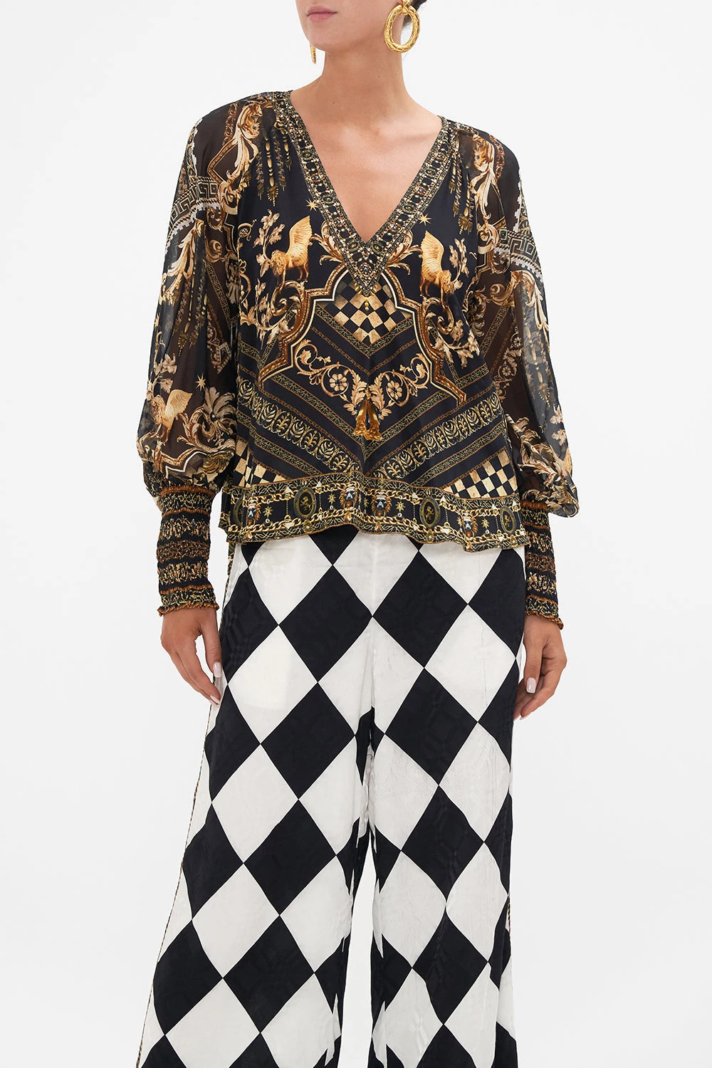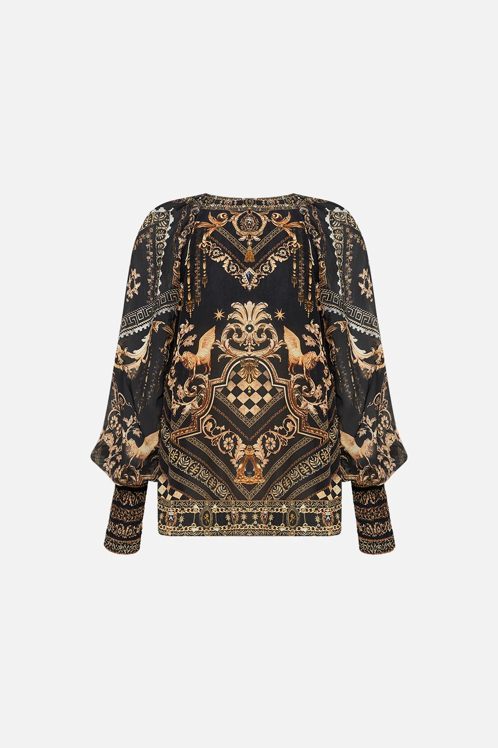 The Duomo Dynasty Shirred Cuff Blouse is a symphony of grand palatial curves. A striking mosaic of onyx and gold highlights the glimmering gold charms and royal crests imbued in myth and magic. Complete with CAMILLA crystals, this luxury silk crepe blouse is home to billowy blouson sleeves, a deep v neckline that meets an intricate amulet, shirring details at the cuffs and a relaxed silhouette made perfect for French tucks. Create a dramatic longline silhouette with the Duomo Dynasty Wide Leg Trouser With Front Pockets for a luxe co-ord look. Lovingly handcrafted, designed in Australia. Explore more from the Amore Mio collection.