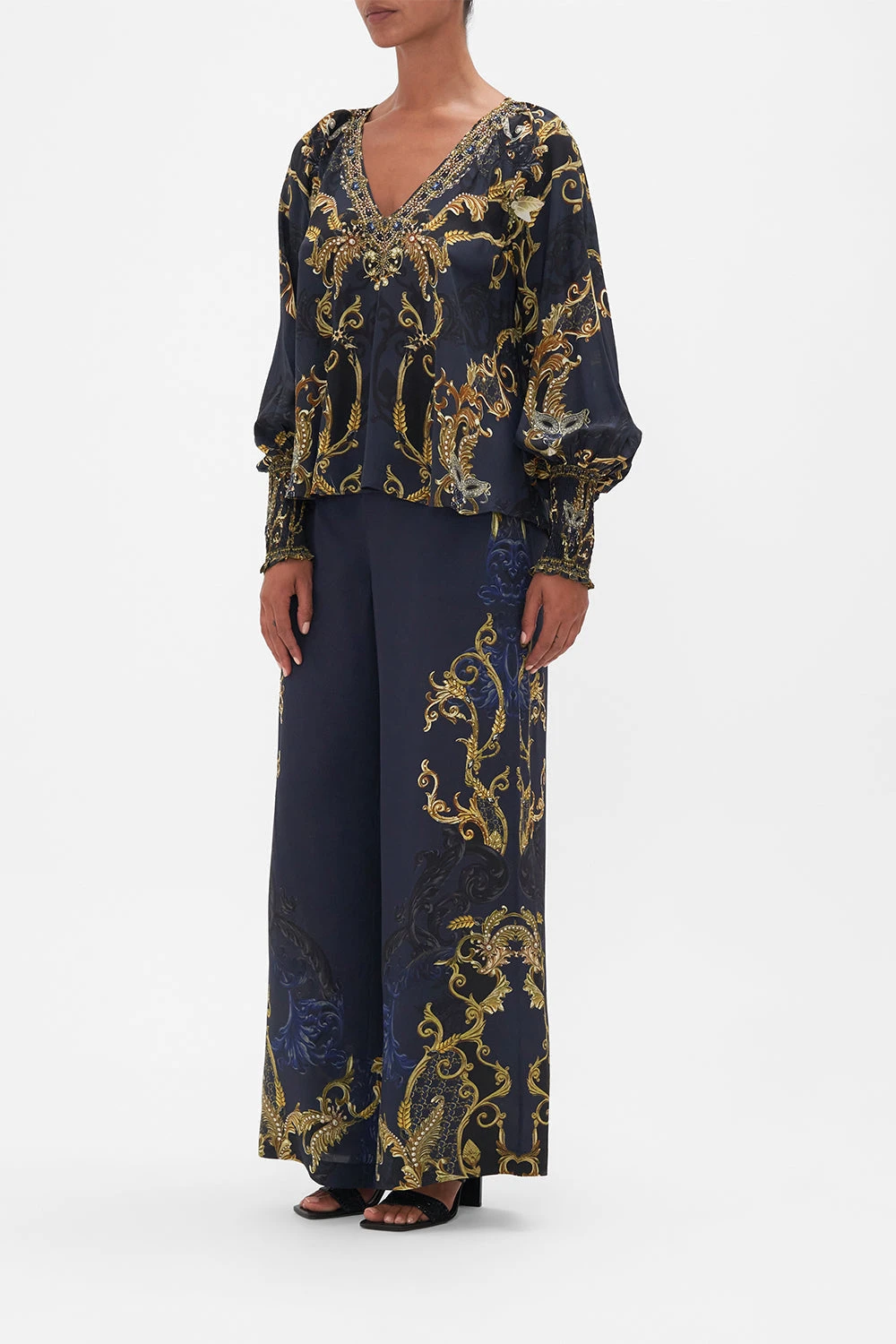 The Moonlight Melodies Shirred Cuff Blouse delves into an arrangement of gold and deep ebony flourishes highlighted with strands of chains, pearls and diamond motifs. Complete with hand-embellished CAMILLA crystals, this luxury silk blouse is home to billowy blouson sleeves, a deep v neckline that meets an intricate amulet, shirring details at the cuffs and a relaxed silhouette made perfect for French tucks. Lovingly handcrafted and designed in Australia, explore more from The Moral Of The Story: Act II collection.