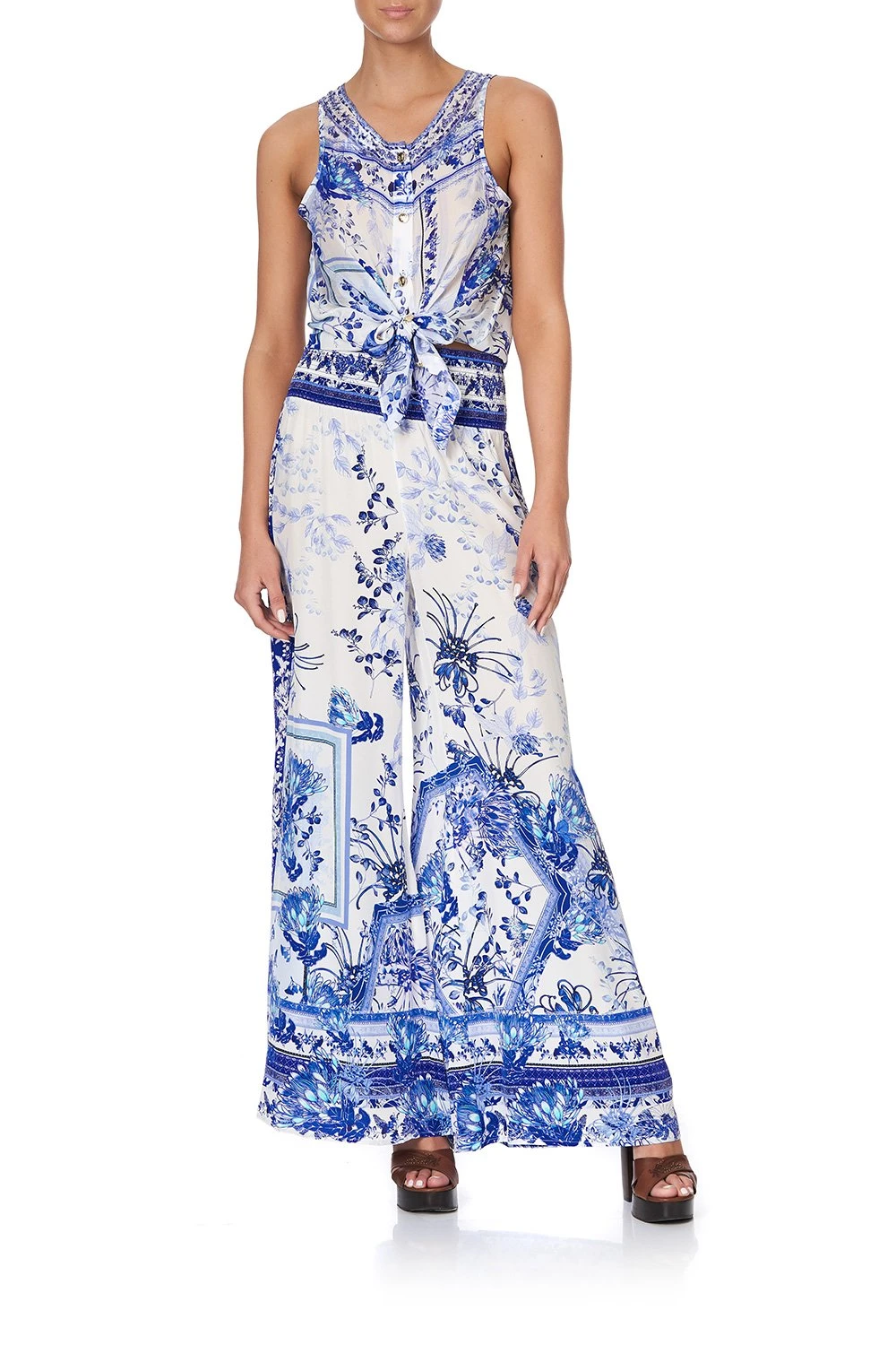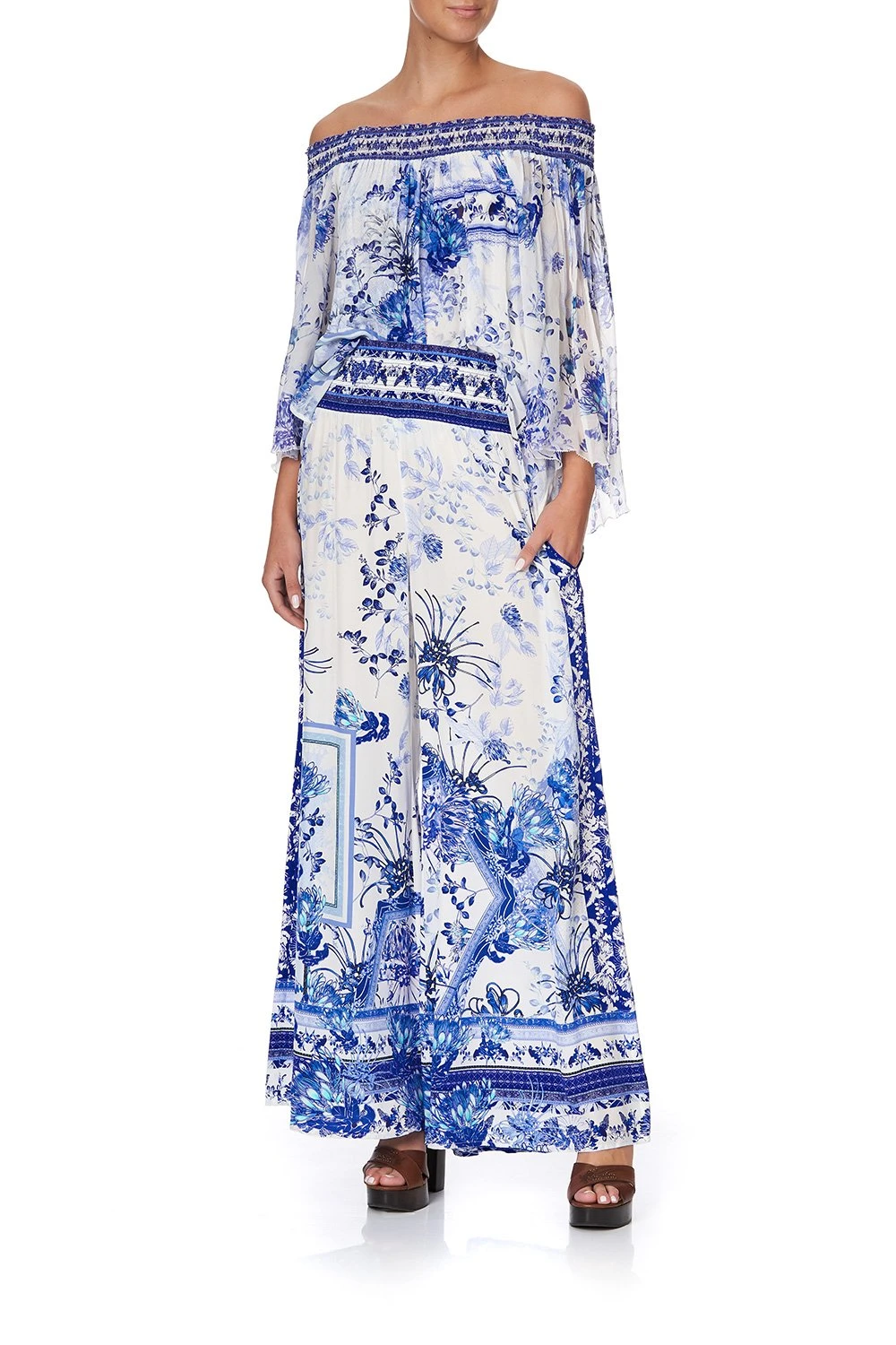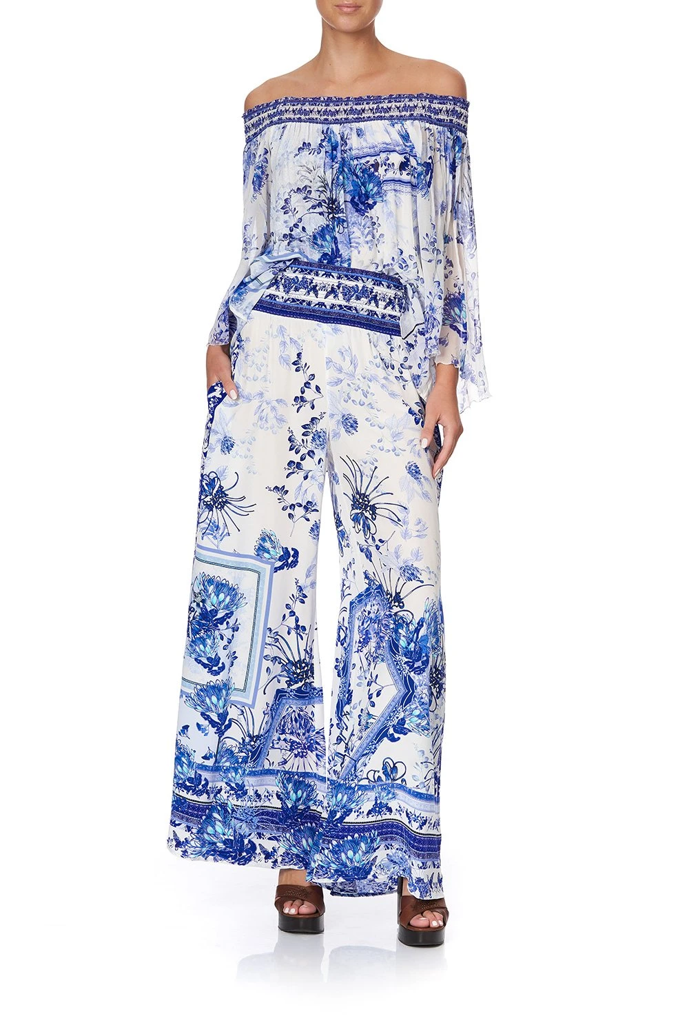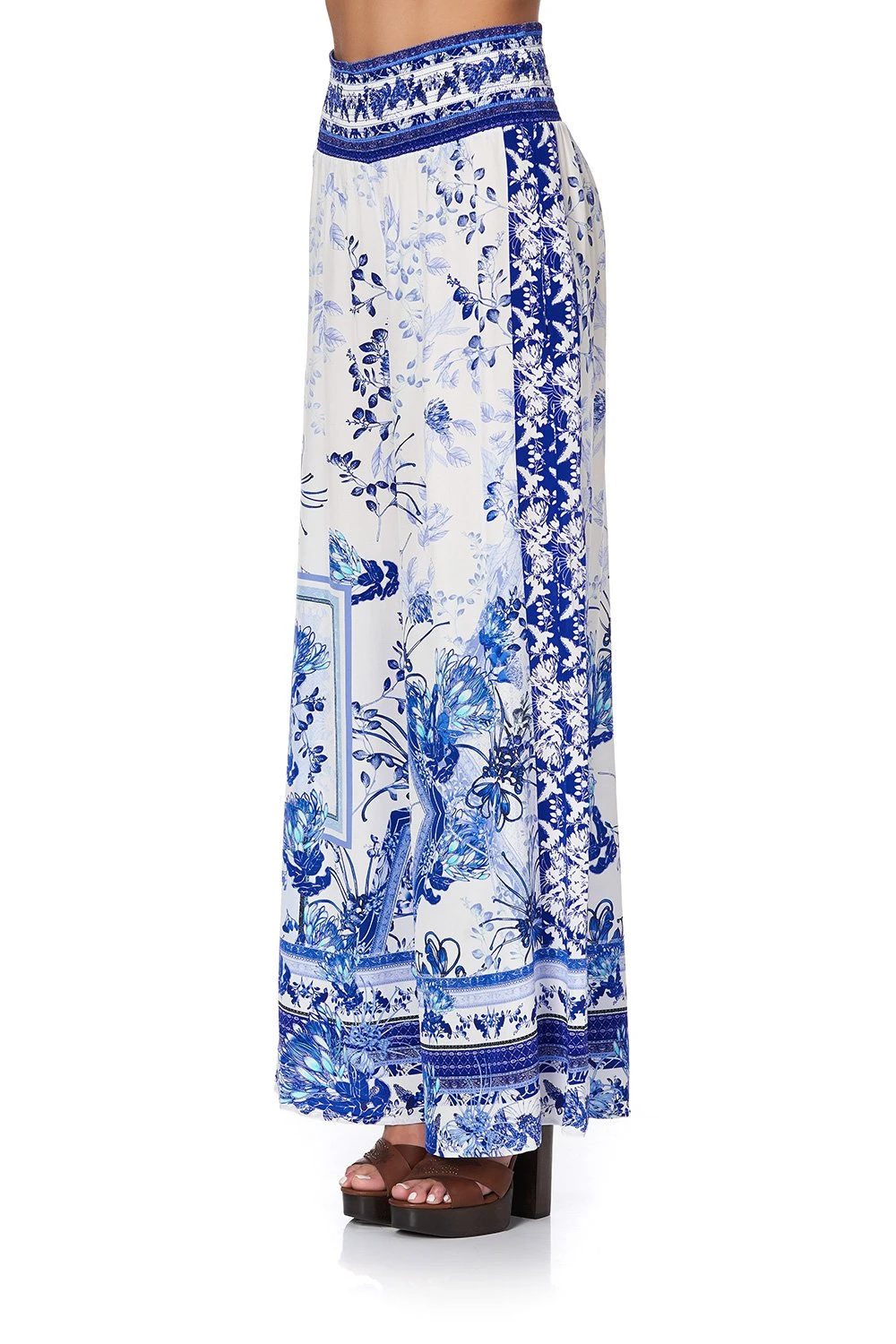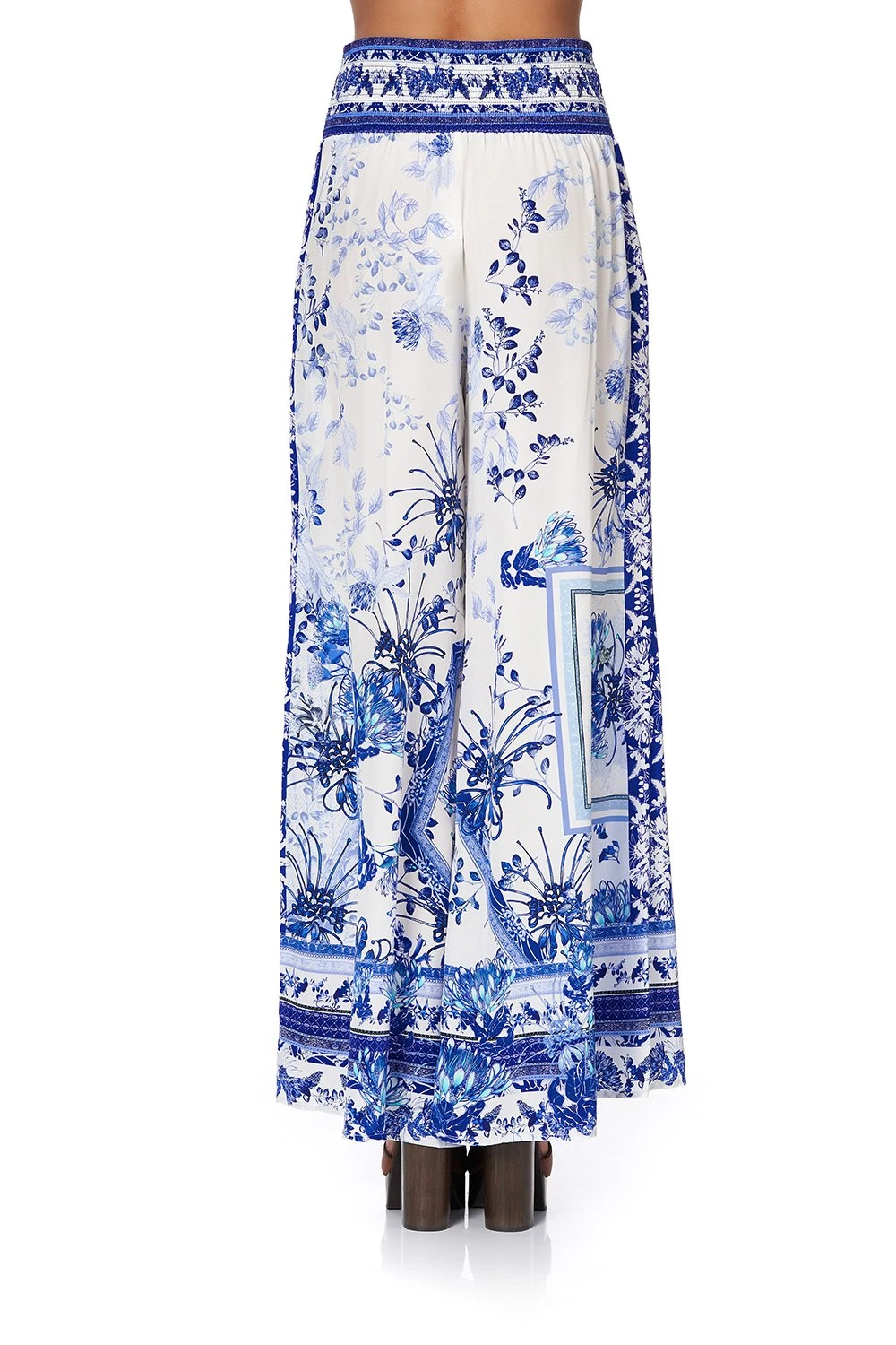 In loving ode to the dreamers who call Fraser Island their home away from home – Cards From The Coast Shirred Waist Paint is proudly opulent. Drawing inspiration from the blue oceans and porcelain white sand, this shirred waist pant is crafted in digitally printed silk that gently flares from the shirred waistband in a flattering silhouette featuring practical side pockets and glistening with hand-placed crystals as detail.