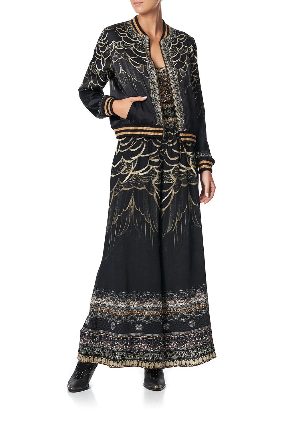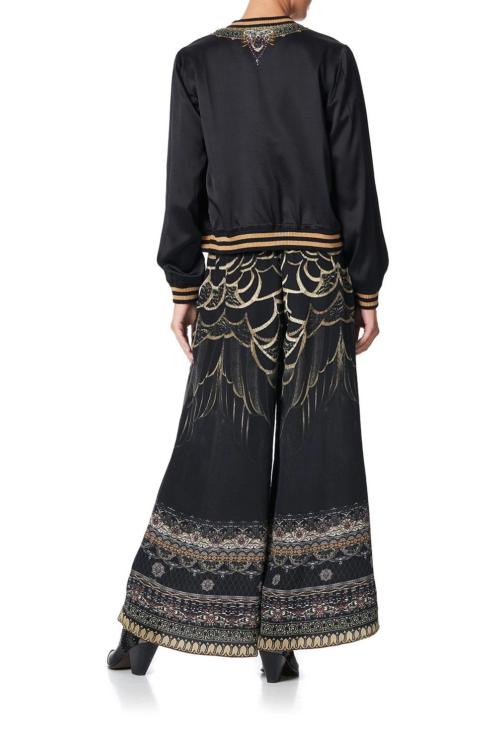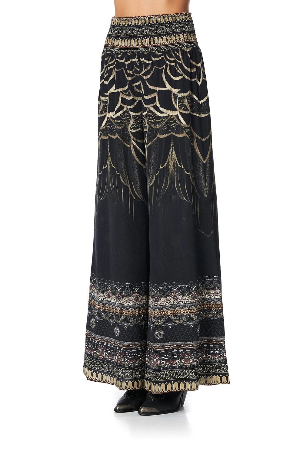 Drawing inspiration from the maternal spirit of our midnight native birds, the Under A Full Moon Shirred Waist Pant is proudly sumptuous. These silk trousers feature practical in-seam pockets, loose flare legs, digitally printed silk, as well as hand-placed crystals as detail.