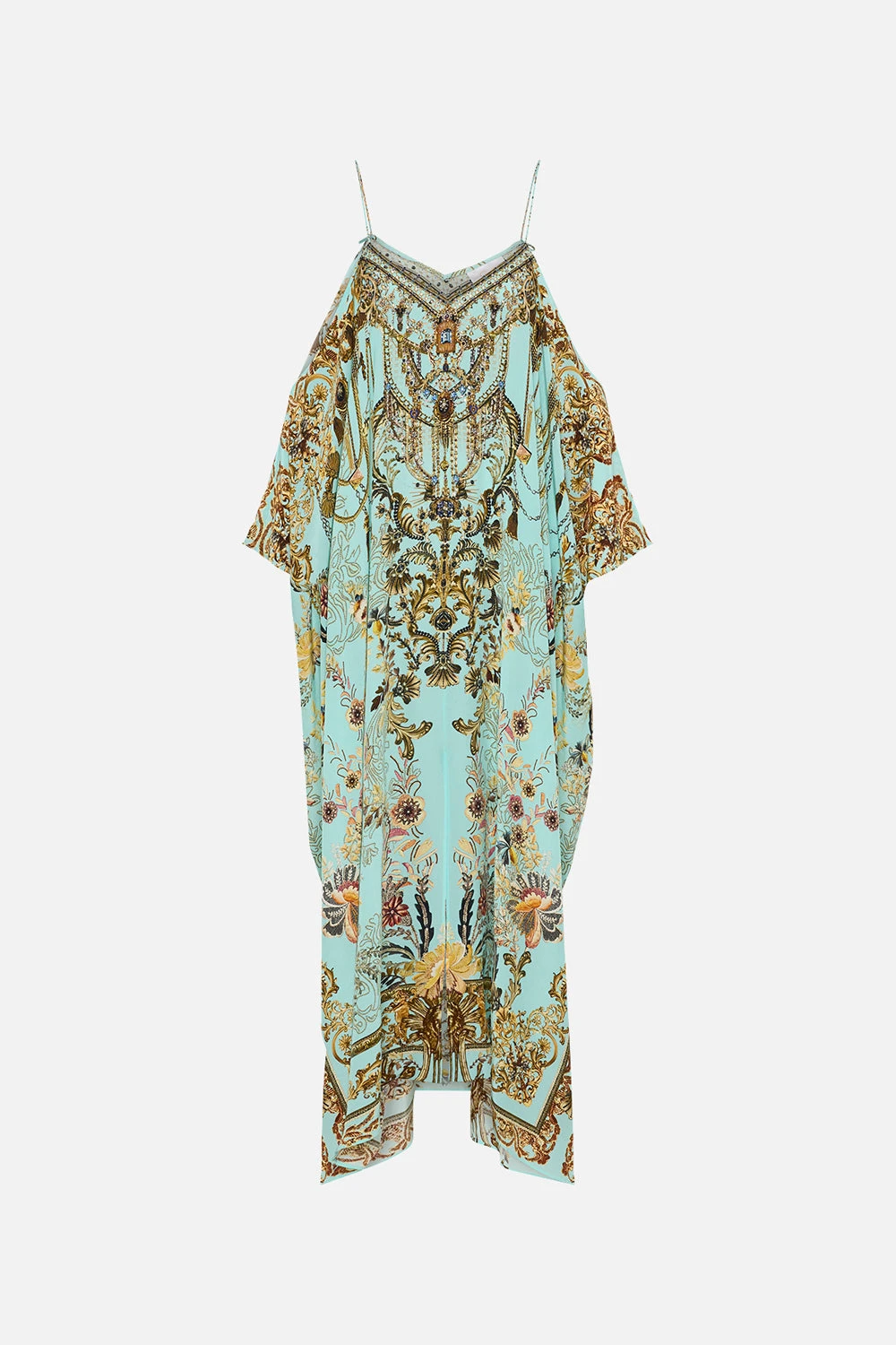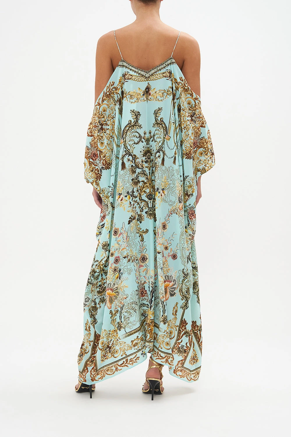 The Adieu Yesterday Shoestring Strap Kaftan explores a mesmorising sea of celestial blue hues finished with ornate golden swirls that dance alongside decadent botanical details and exquisite chain cascades. Crafted from effortlessly soft silk, this luxury kaftan is home to a relaxed maxi silhouette that falls into a drop shoulder sleeve, hand-embellished crystal adornments that dance along a timeless v neckline and a multi-wear design.