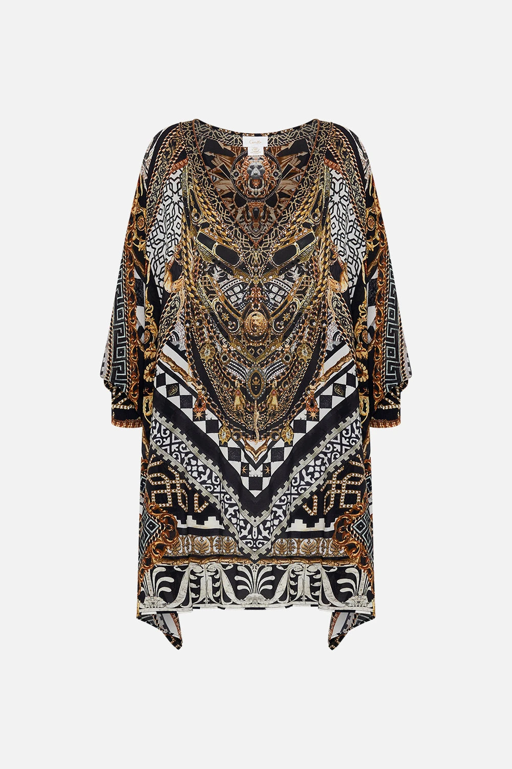 The Look Up Tesoro Short Kaftan With Cuff embodies a striking mosaic of bold graphic borderlines that dance with the opulence of gilded baroque filigree. Crafted from signature silk, this luxury CAMILLA kaftan dress features statement batwing sleeves that gather into jersey cuffs, a v neckline for an elegant hint of bare skin and a relaxed fit silhouette that drapes and falls effortlessly at the shaped hemline. An elegant resort wear holiday dress or worn as a bold statement party dress. Lovingly handcrafted , designed in Australia. Explore more from the Amore Mio collection.