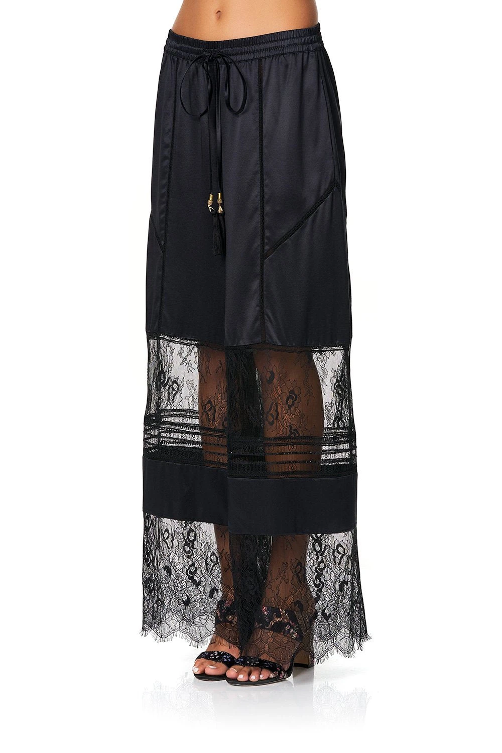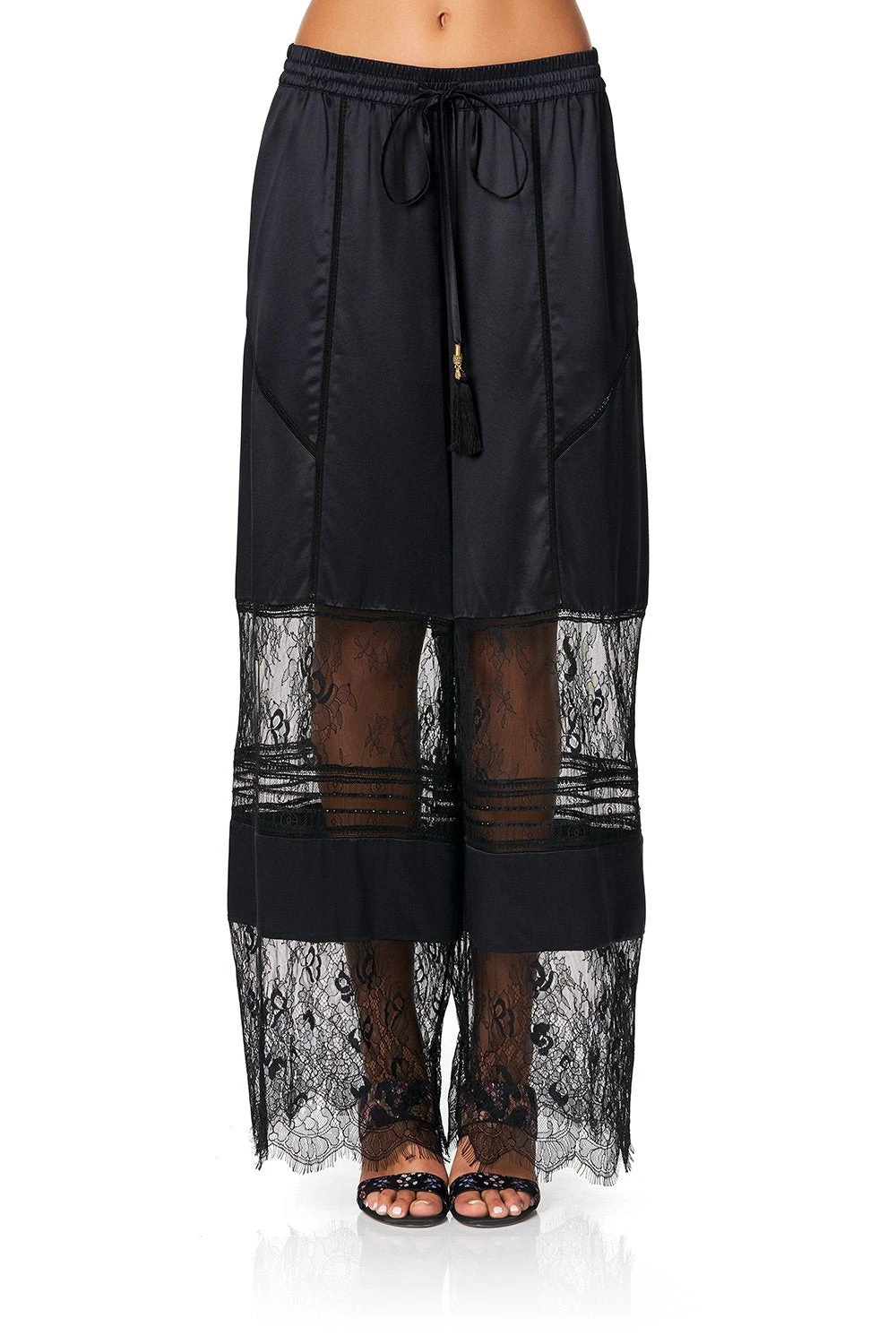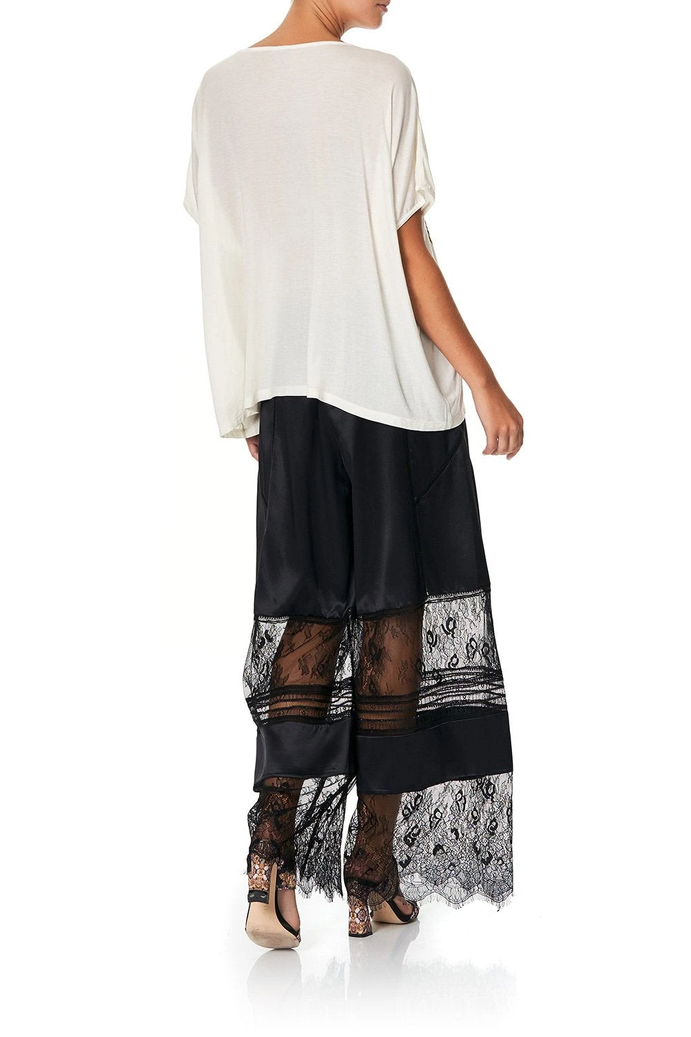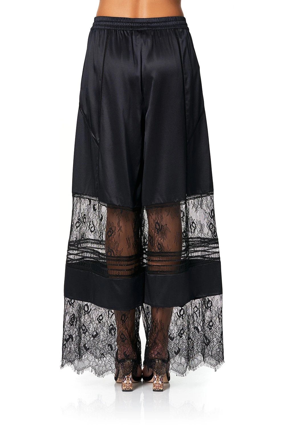 With elegant French style as muse, the Noir Boudoir Spliced Wide Leg Pant with Gathered Pockets is for lovers of delicate detailing. Featuring flirtatious insert lace panels around the calves, bundled trim, alluring elasticated drawcord waist, as well as hand-placed crystals as detail – these silk trousers are both striking and sophisticated.
