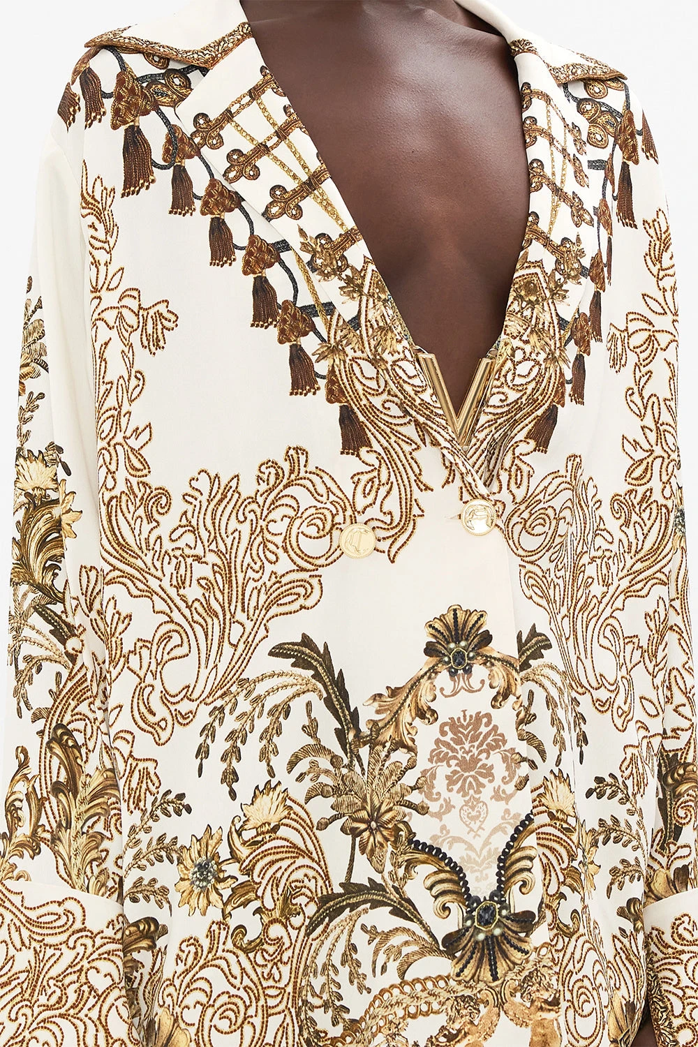 The Road To Richesse Split Cuff Jacket explores a mesmorising sea of ivory white hues finished with ornate golden swirls that dance alongside decadent botanical details and exquisite chain cascades. Crafted from breathable viscose, this luxury jacket is home to a statement lapel dipped in hand-embellished CAMILLA crystals, a tantalilsing wide cuff that dances at the wrist and a matching waist-tie that completes button hardware.