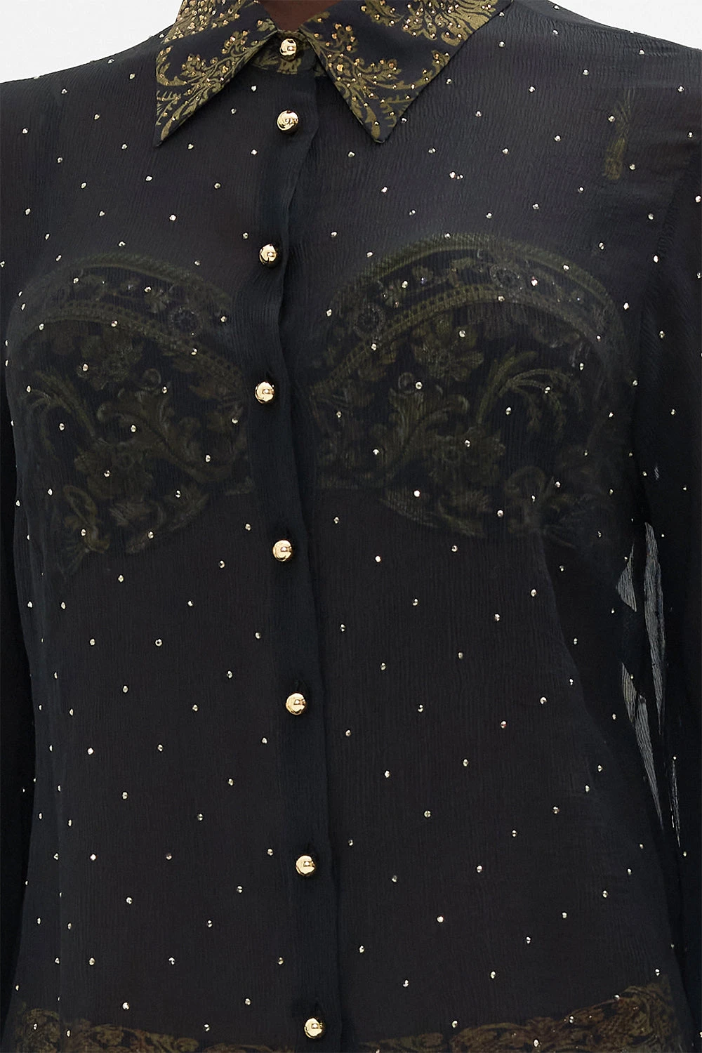 The Night is Noir Split Sleeve Blouse explores a mesmorising sea of midnight hues finished with ornate golden swirls that dance alongside decadent botanical details and exquisite chain cascades. Adorning hand-embellished CAMILLA crystals, this luxury silk shirt features a delicate blouson sleeve, button hardware, a structured collar and a relaxed silhouette.