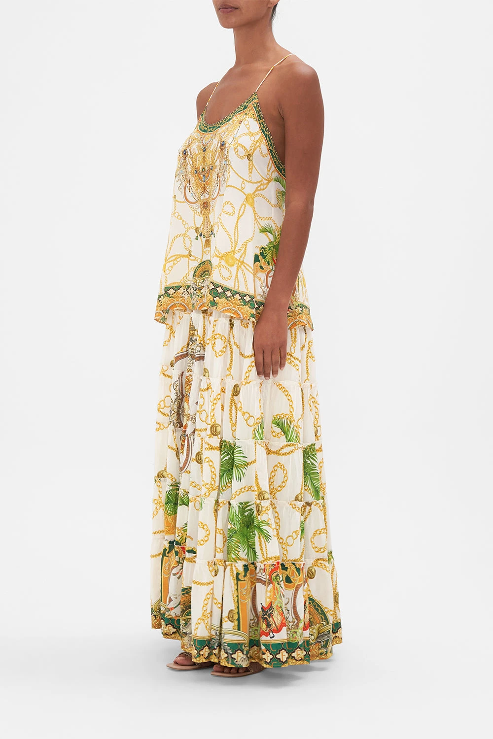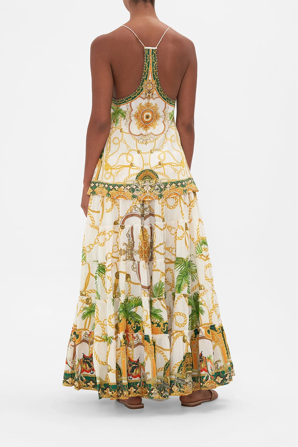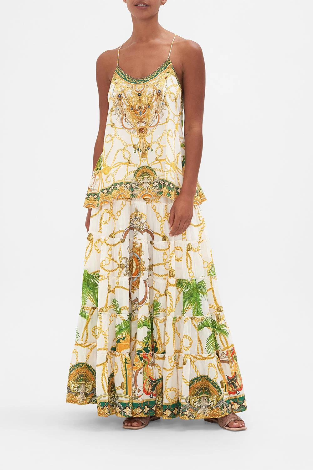 My Sweet Devotion T Back Shoestring Top glides into a world of elegant palatial curves boldly outlined in geometric mosaics. Gold regal motifs dance in amongst lions and stallions, intertwined with golden chains and lush emerald green foliage against porcelain white. Adorned with hand-embellished CAMILLA crystals, this statement silk camisole plays host to intricate back detailing, a shaped flared hemline that falls into a timelessly relaxed silhouette and dainty shoestring straps. Lovingly handcrafted and designed in Australia, explore more from The Moral Of The Story: Act II collection.