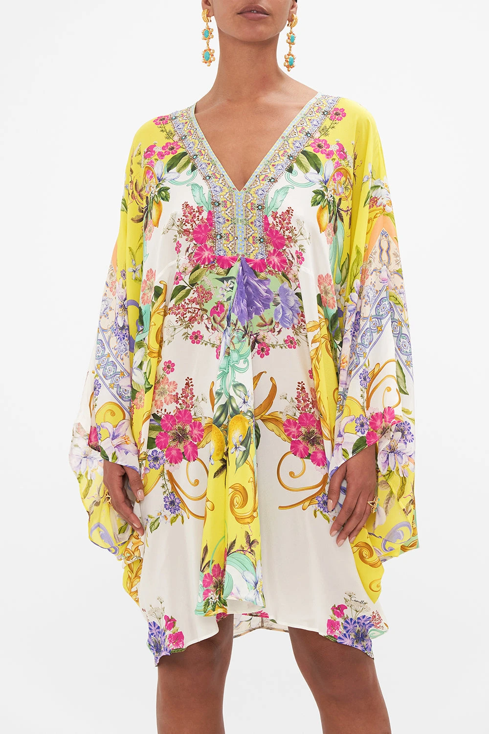 The Caterina Spritz T Shape Short Kaftan wanders through an elaborate arrangement of Italian mosaics, fresh citrus fruits and florals. A bright golden yellow path and grandiose arches reminiscent of the iconic Hotel Santa Caterina. A dance of soft draping details that gently taper towards the hemline, this luxuriously floaty silk CAMILLA kaftan scintillates with CAMILLA crystal embellishments along the deep V neckline, a dramatic statement piece in an oversized relaxed fit mini silhouette, that softly skims the mid thigh. Wear as luxe resort wear or as a statement party dress. Lovingly handcrafted, designed in Australia. Explore more from the Amore Mio collection.