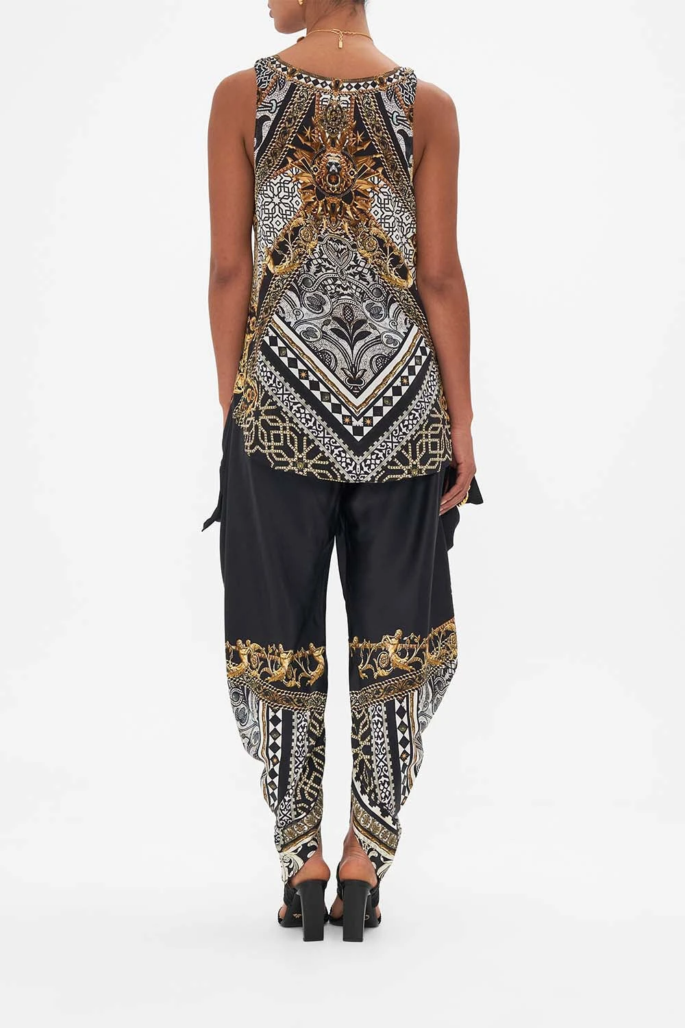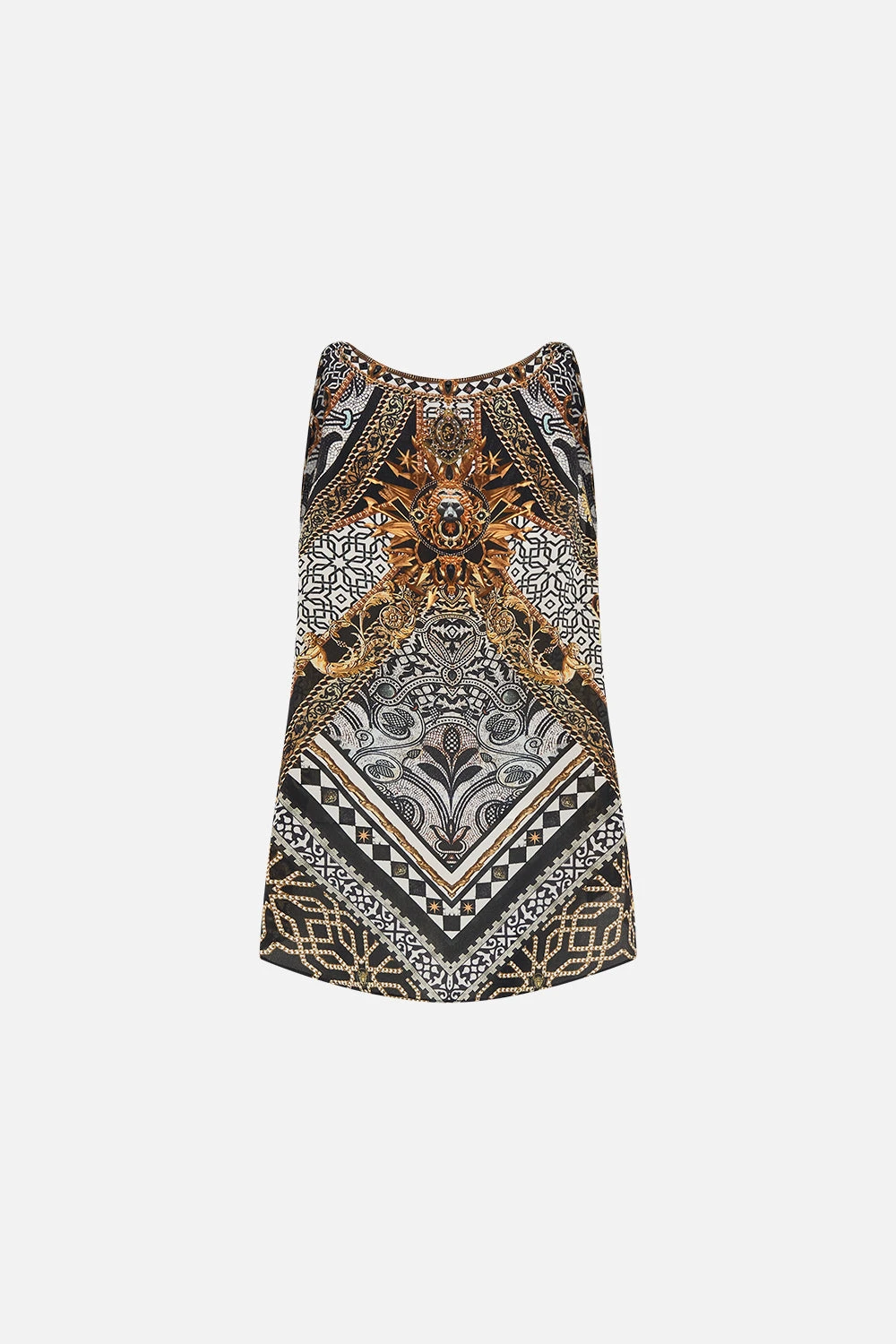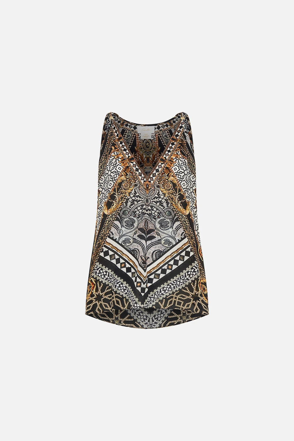 The Look Up Tesoro Tank Top With Strap Bead Detail embodies a striking mosaic of bold graphic borderlines that dance with the opulence of gilded baroque filigree. Adorning CAMILLA crystals, this luxury silk top is home to gold hardware upon the decolletage, a relaxed silhouette that falls into a flare hemline and a deep v neckline. Pair back with the Look Up Tesoro draped side pant as a lavishly printed matching set. Lovingly handcrafted, designed in Australia. Explore more from the Amore Mio collection.