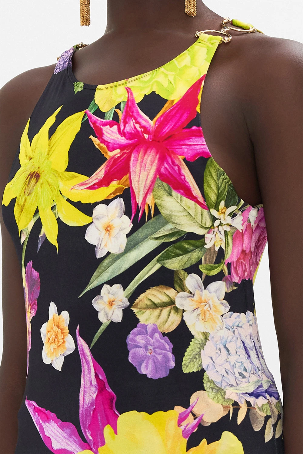 The Peace Be With You Tank With Hardware explores a decadent sea of midnight hues finished with blooming peonies dipped in canary hues, tulips wrapped in mesmorising tones and lilac hydrangeas nestled between leafy greens. Complete with hand-embellished CAMILLA crystals, this luxury muscle tank features a fitted sleeveless silhouette, a crew neckline and an easy slip-on style.