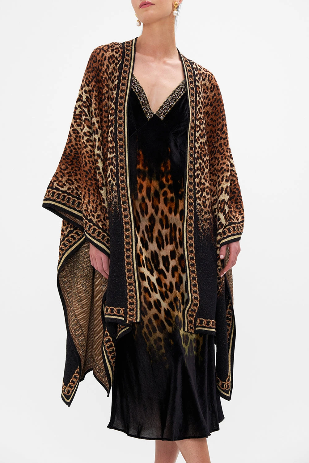 The Jungle Dreaming Throwover is a tantalising vision of wild animal and tribal inspired geo patterns. A melding arrangement of glimmering chains, charms and topaz highlights. Crafted from a luscious viscose blend, this luxury throw over plays host to a wrap-style silhouette that falls into a midi handkerchief hem, hand-embellished CAMILLA crystals, jacquard accents and a relaxed cut that slips on effortlessly. Lovingly handcrafted and designed in Australia, explore more from The Moral Of The Story: Act II collection.
