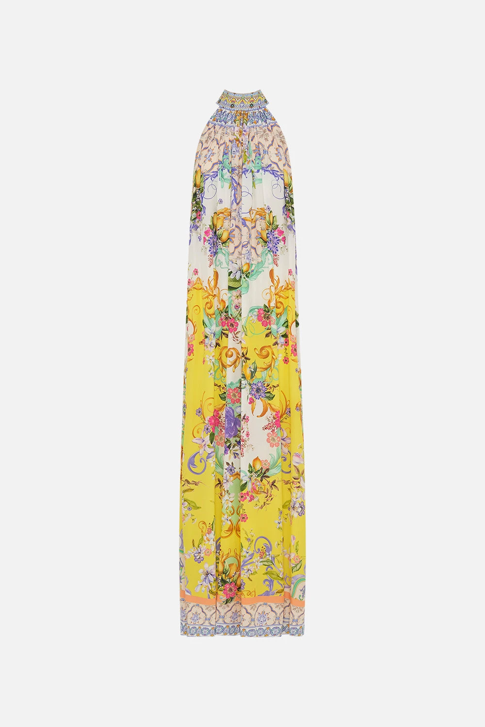 The Caterina Spritz Tie Neck Long Dress wanders through an elaborate arrangement of Italian mosaics, fresh citrus fruits and florals. A bright golden yellow path and grandiose arches reminiscent of the iconic Hotel Santa Caterina. Adorning CAMILLA crystals, this luxury silk dress features a contrasting high neckline that falls into a gathered detail, a relaxed longline silhouette and dainty tie accents. An elegant silhouette with versatility worn back to front with ties loosely tied at the front neckline. Lovingly handcrafted, designed in Australia. Explore more from the Amore Mio collection.