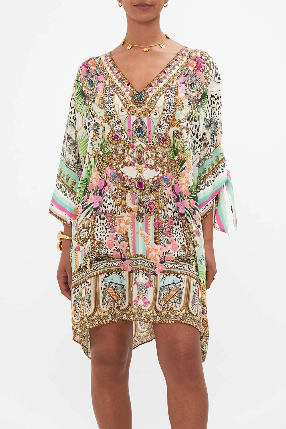 The Dear Amore Mio Tie Sleeve Short V Neck Kaftan depicts a world of lush foliage and feline motifs dancing amongst golden archways. Adorning signature crystal embellishments, this luxury silk CAMILLA kaftan is home to a deep v neckline that meets an intricate amulet, batwing sleeves that fall into functional tie details at cuffs, and an exquisitely relaxed silhouette. Wear as luxe resort wear or as a statement party dress. Lovingly handcrafted, designed in Australia. Explore more from the Amore Mio collection.