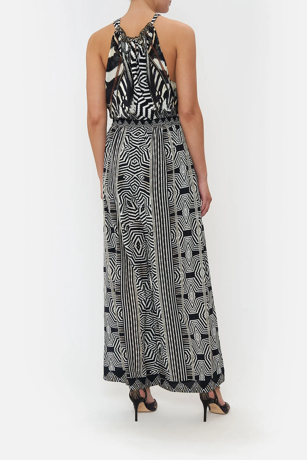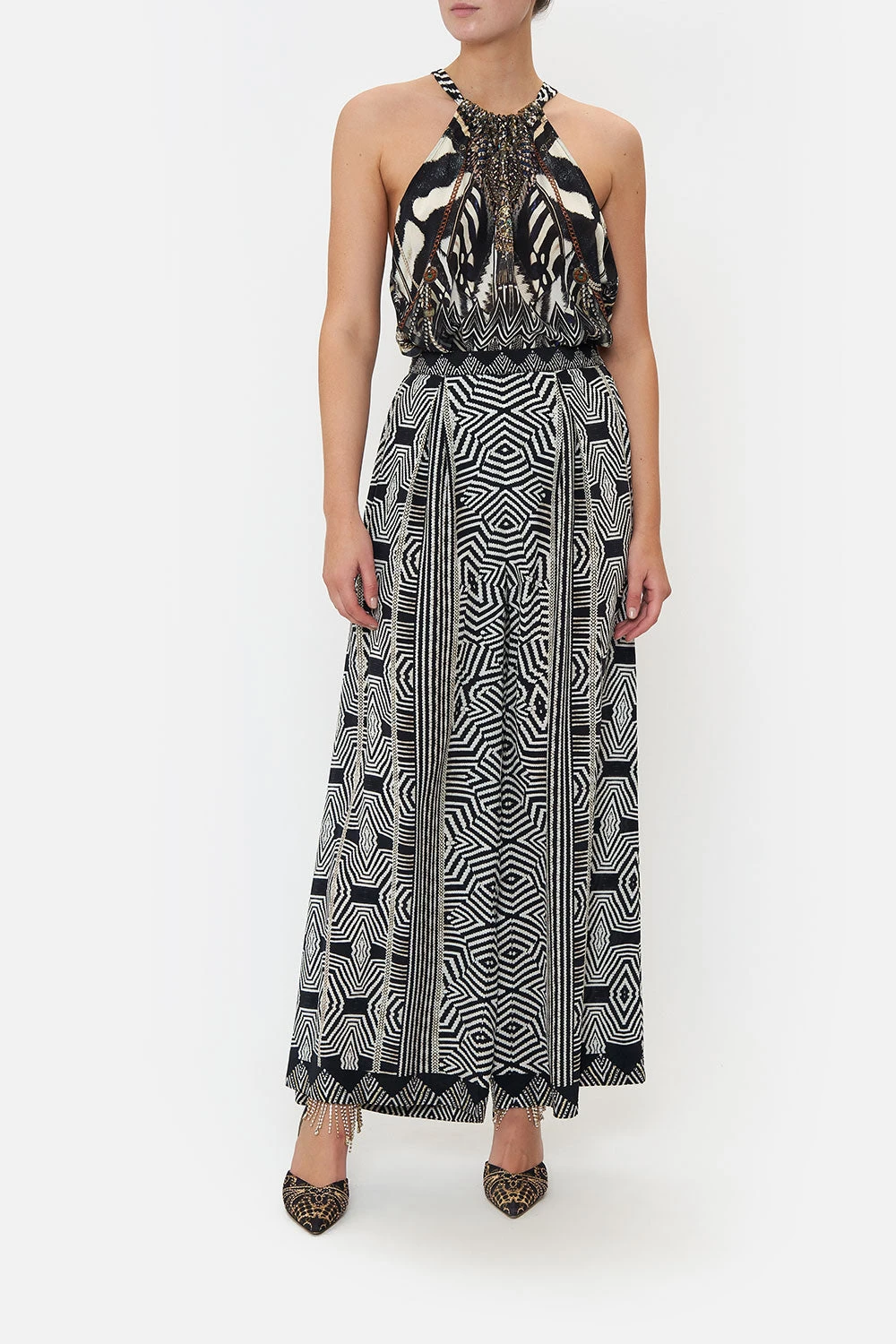 Wild cascades dipped in everyday comforts, the Knight Of The Wild Tuck Front Pant effortlessly melts monochromatic panelling immersed in slated hues and pops of midnight. Crafted from breathable silk, these luxury summer pants feature a contrasting waistband, a wide statement leg, a relaxed full-length silhouette and panel trim.