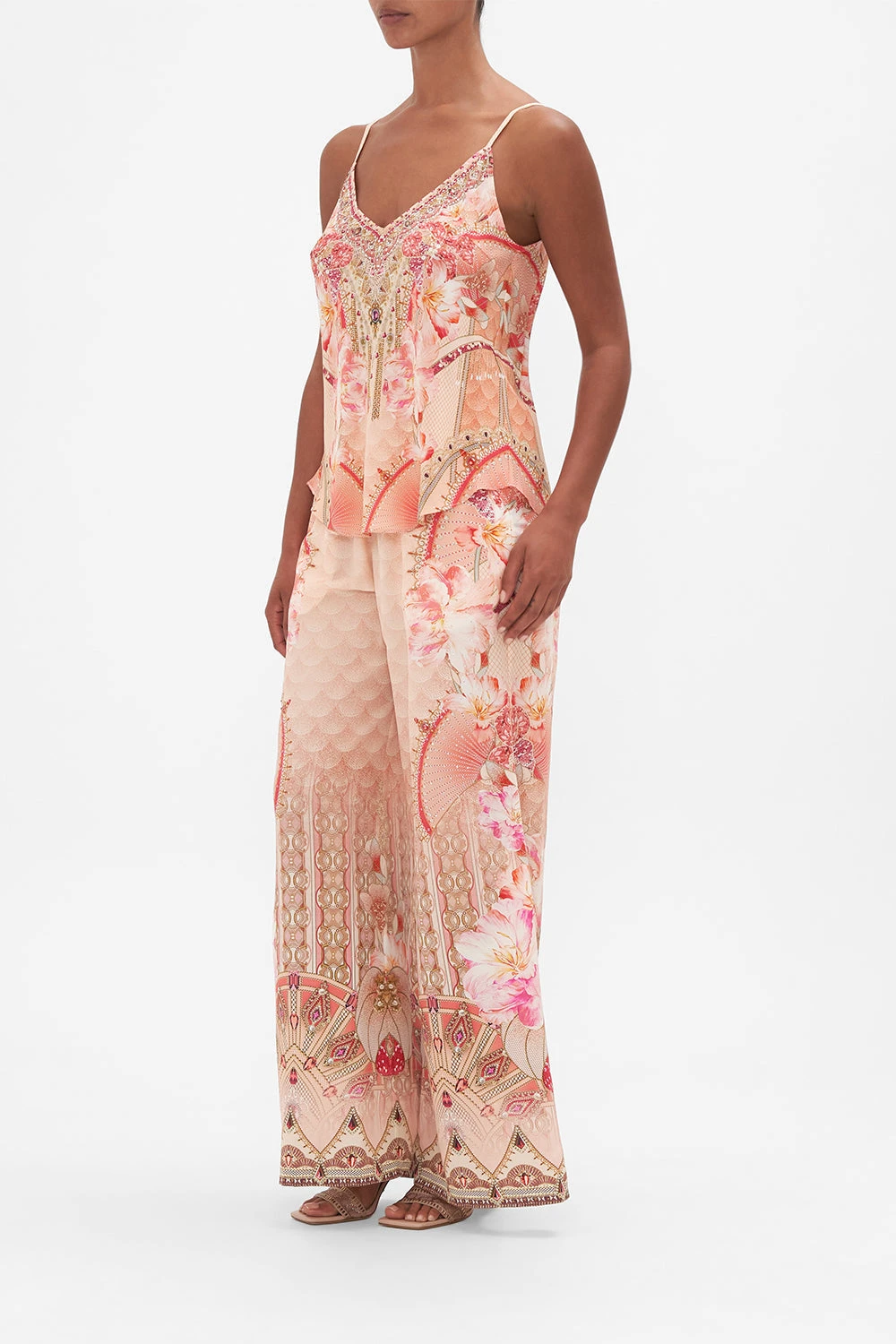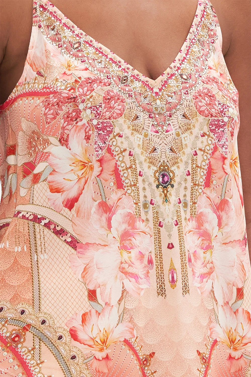 The Adore Me V Neck Bias Cami embodies an arrangement of soft pink blooms set against delicate unfurling fans of pretty pearls and sparkling jewels. Adorning hand-embellished CAMILLA crystals, this luxury silk camisole plays host to a soft v neckline that falls into a relaxed bodice and flared hemline, an on-the-bias silhouette that skims the curves with a tantalising low back detail and adjustable rouleau straps. Lovingly handcrafted and designed in Australia, explore more from The Moral Of The Story: Act II collection.