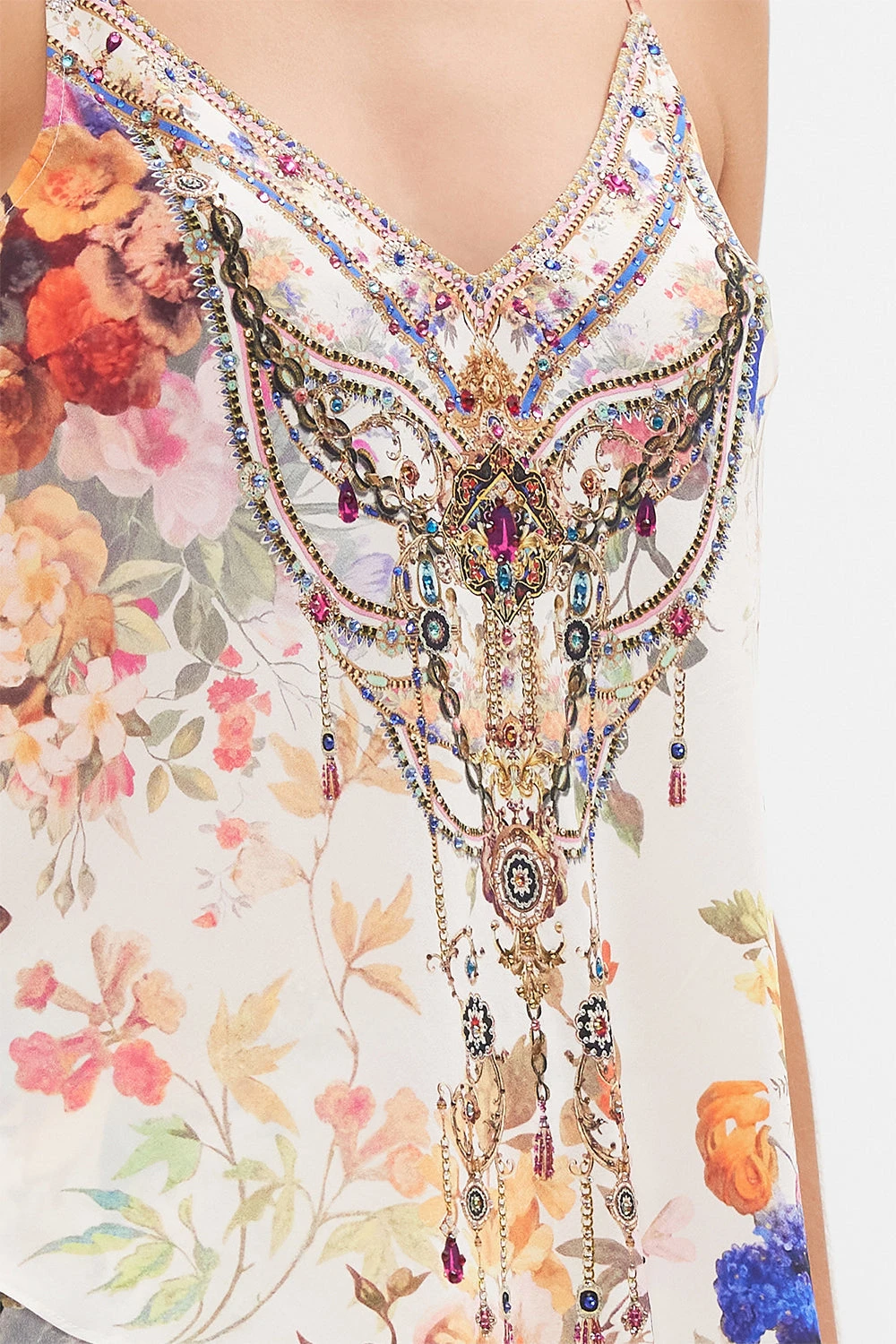 The Friends With Frescos V Neck Bias Cami captures the exquisite ambiance of the grand Hotel Villa Cora. Soft flowing curves guide us along opulent mosaics in a rich tapestry of pretty florals and baroque accents. Adorning signature CAMILLA crystals, this luxury silk camisole plays host to a soft v neckline that falls into a relaxed bodice and flared hemline, an on-the-bias silhouette that skims the curves with a tantalising low back detail and adjustable rouleau straps. Pair back with the Friends With Frescos Maxi Wrap Skirt for opulent fit and flare finesse. Lovingly handcrafted, designed in Australia. Explore more from the Amore Mio collection.