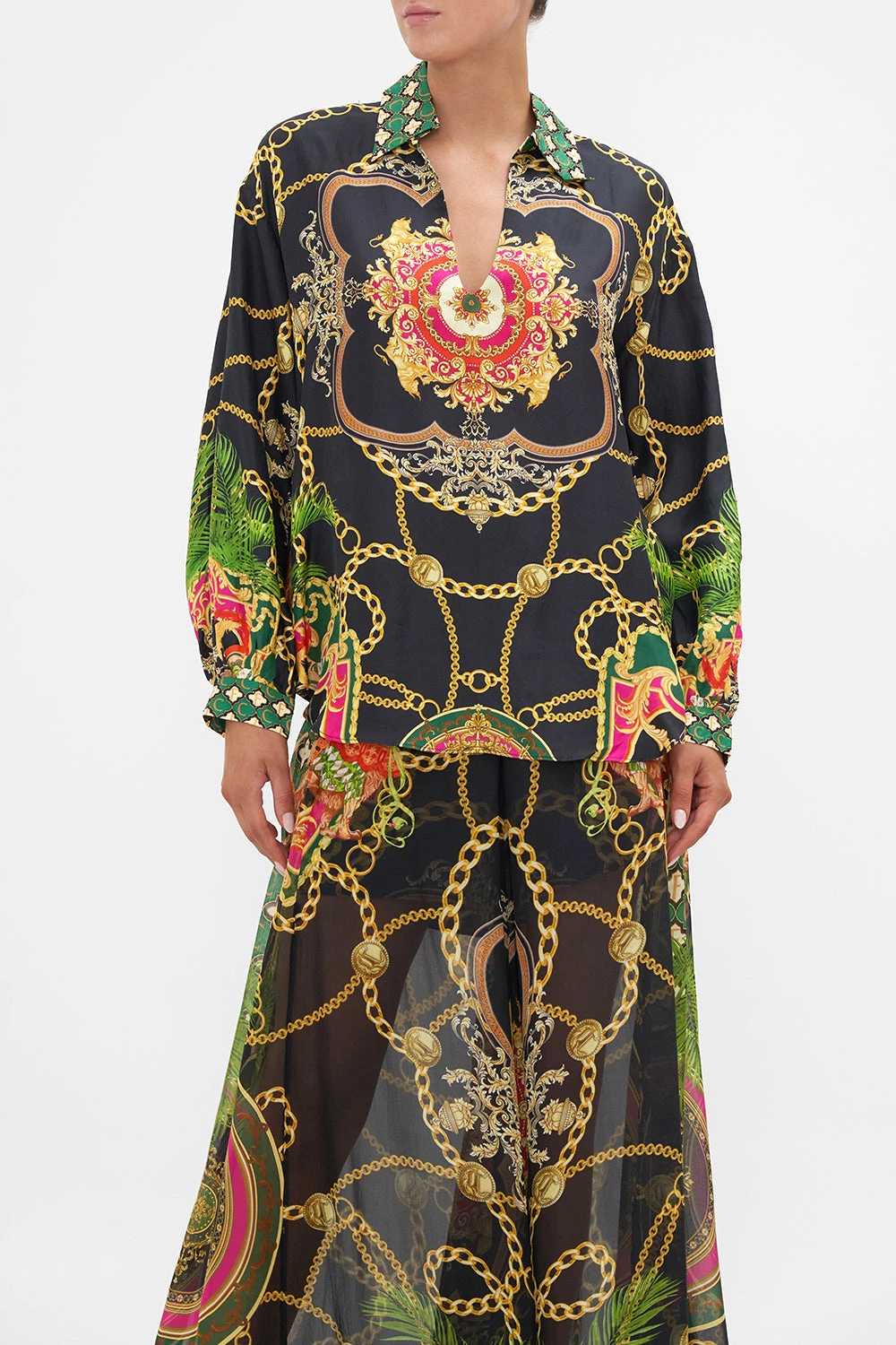 The Jealousy & Jewels V-Neck Blouse With Collar commands a rhapsody of elegantly curved formations framed with geometric mosaics. Gilded regal crests and equestrian motifs delicately intertwine with a net of gold chains and vibrant emerald green foliage. Crafted from signature CAMILLA silk, this luxury blouse plays host to timelessly tailored collar adorned in hand-embellished crystals, voluminous blouson sleeves and a deep v neckline that falls into a relaxed silhouette. Lovingly handcrafted and designed in Australia, explore more from The Moral Of The Story: Act II collection.