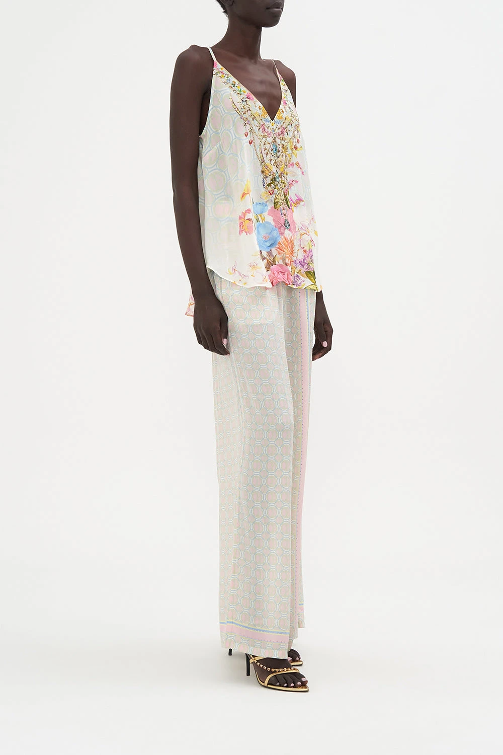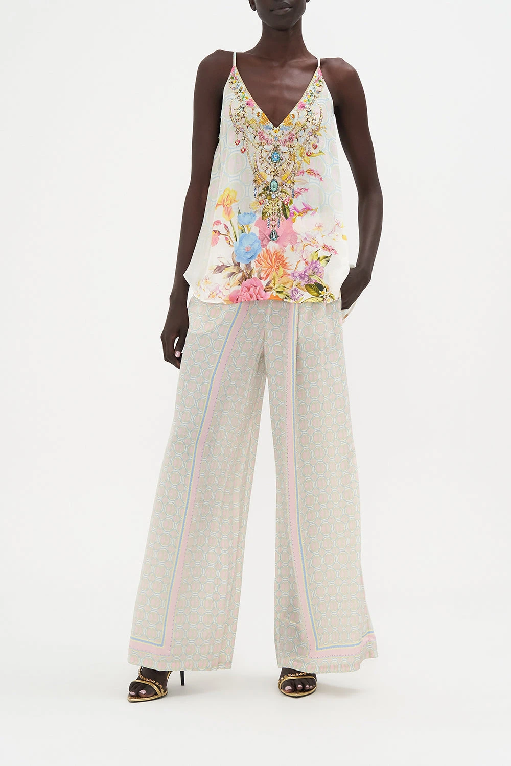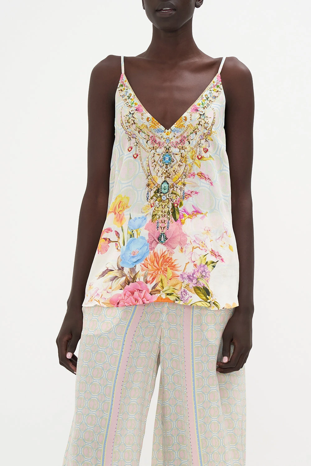 The Sunlight Symphony V Neck Cami captivates the eye with a soft pink hue finished with poppies wrapped in gentle blues, carnations in blushing tones and the delicate cascade of leafy vines. Complete with hand-embellished CAMILLA crystals, this luxury silk cami plays host to a deep v neckline, adjustable shoestring straps, darting at the busts and a relaxed silhouette.