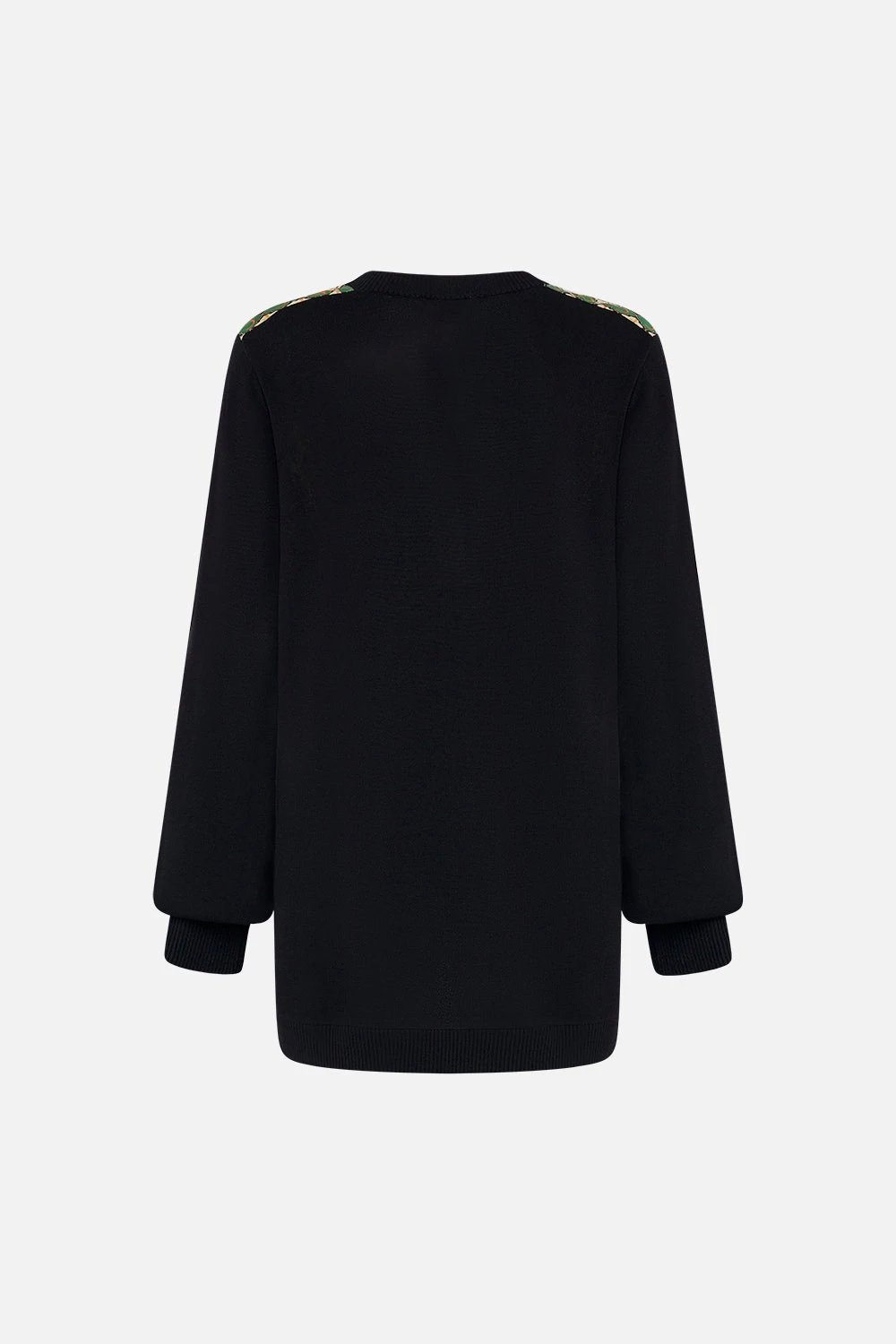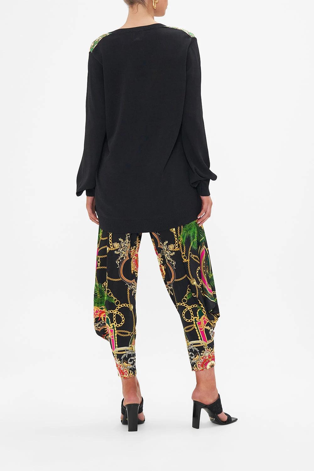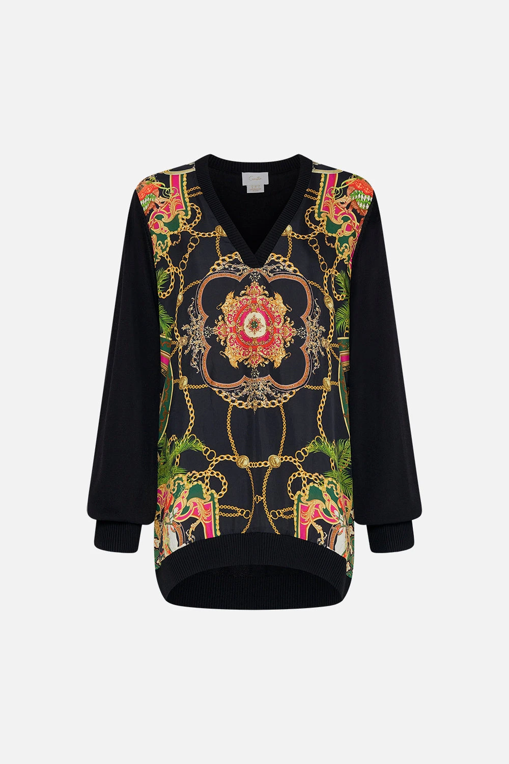 The Jealousy & Jewels V Neck Silk Front Jumper commands a rhapsody of elegantly curved formations framed with geometric mosaics. Gilded regal crests and equestrian motifs delicately intertwine with a net of gold chains and vibrant emerald green foliage. Crafted in a soft rayon nylon blended knit, this luxury jumper features a deep v neckline, silk printed front panel on the body, blouson sleeves and a wide cuff, finely finished with hem and neckline trim details. Lovingly handcrafted and designed in Australia, explore more from The Moral Of The Story: Act II collection.