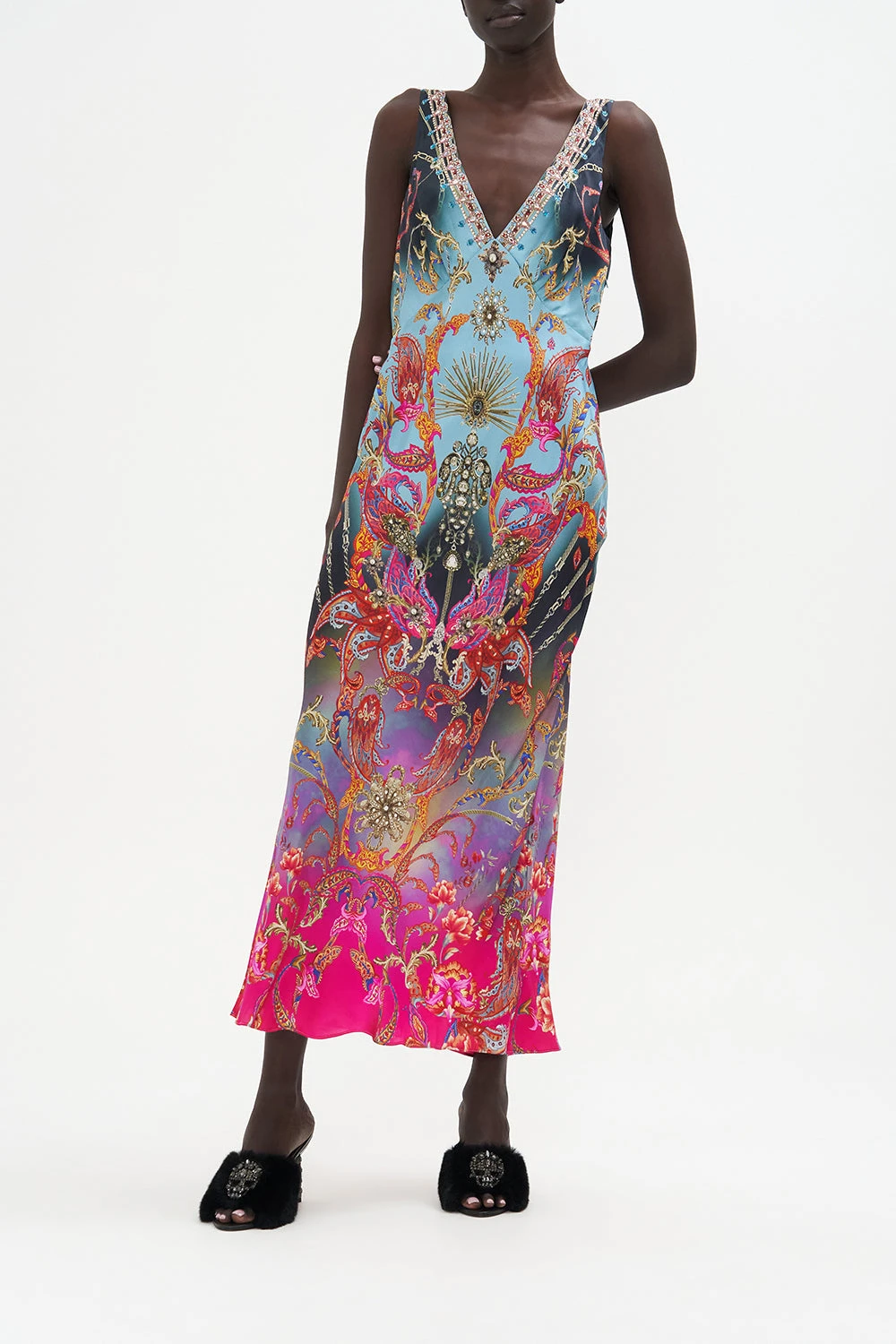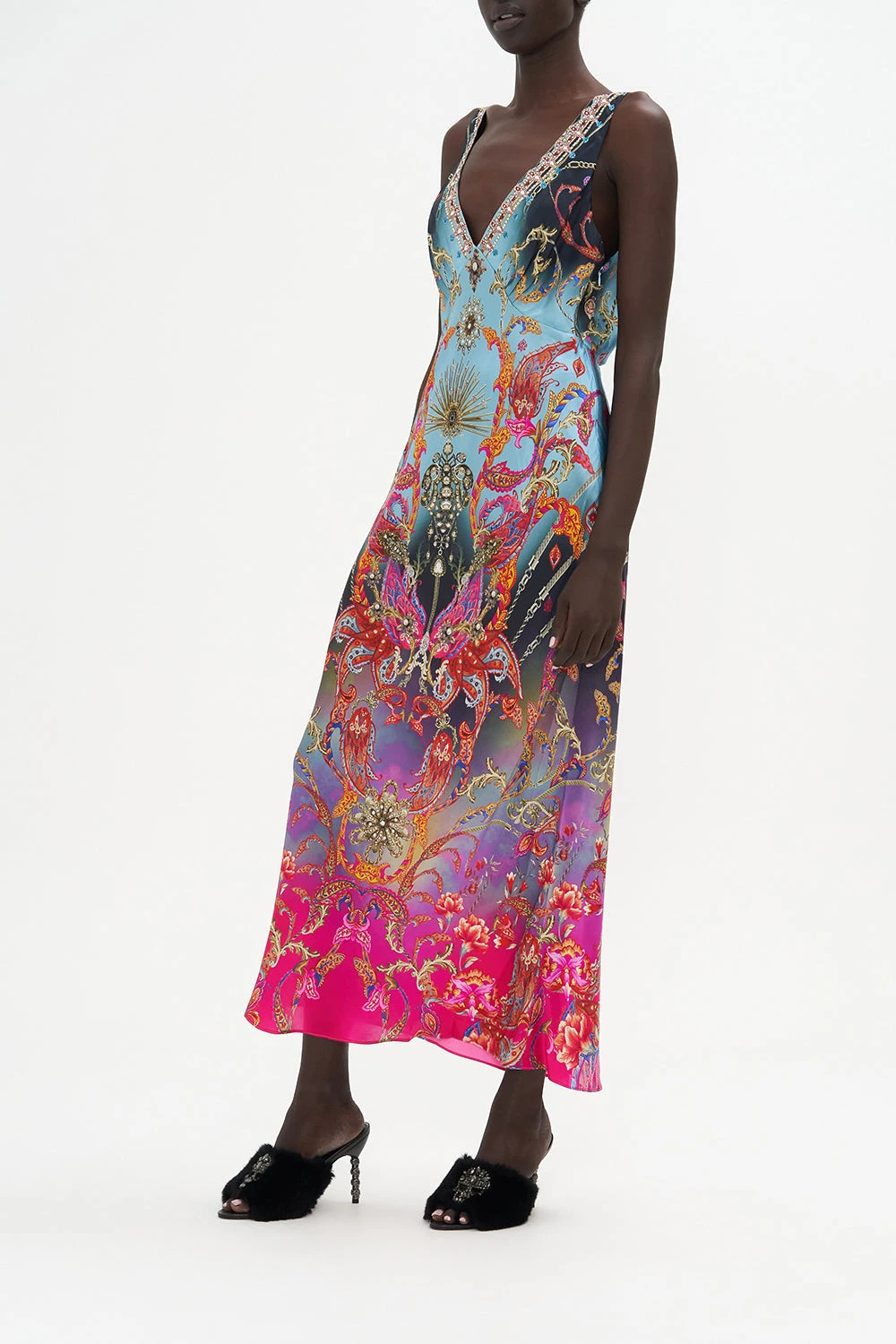 The What Lies Beneath V-Neck Slip Dress welcomes the eye to paradise with a sky blue hue graced with paisley patterns dipped in raspberry tones, gold baroque details and a soft gradient that falls into shades of lavender. Crafted in the softness of silk crepe, this luxury slip dress plays host to a timeless v neckline adorned in hand-embellished crystals, invisible zip fastening for effortless enclosure and a panelled bodice detail for ultimate fit perfection.
