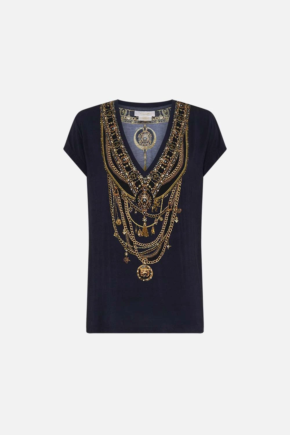 The Duomo Kaleido V Neck Tee celebrates the baroque details synonymous with the opulence of grand Italian duomos. Crafted with crystal embellishments, this luxury tee features a sleek v neckline, cropped sleeves, a relaxed loose-fit silhouette and a softly curved hemline. Pair with the Duomo Kaleido Straight Leg Track Pant for effortless casual chic. Lovingly handcrafted, designed in Australia. Explore more from the Amore Mio collection.