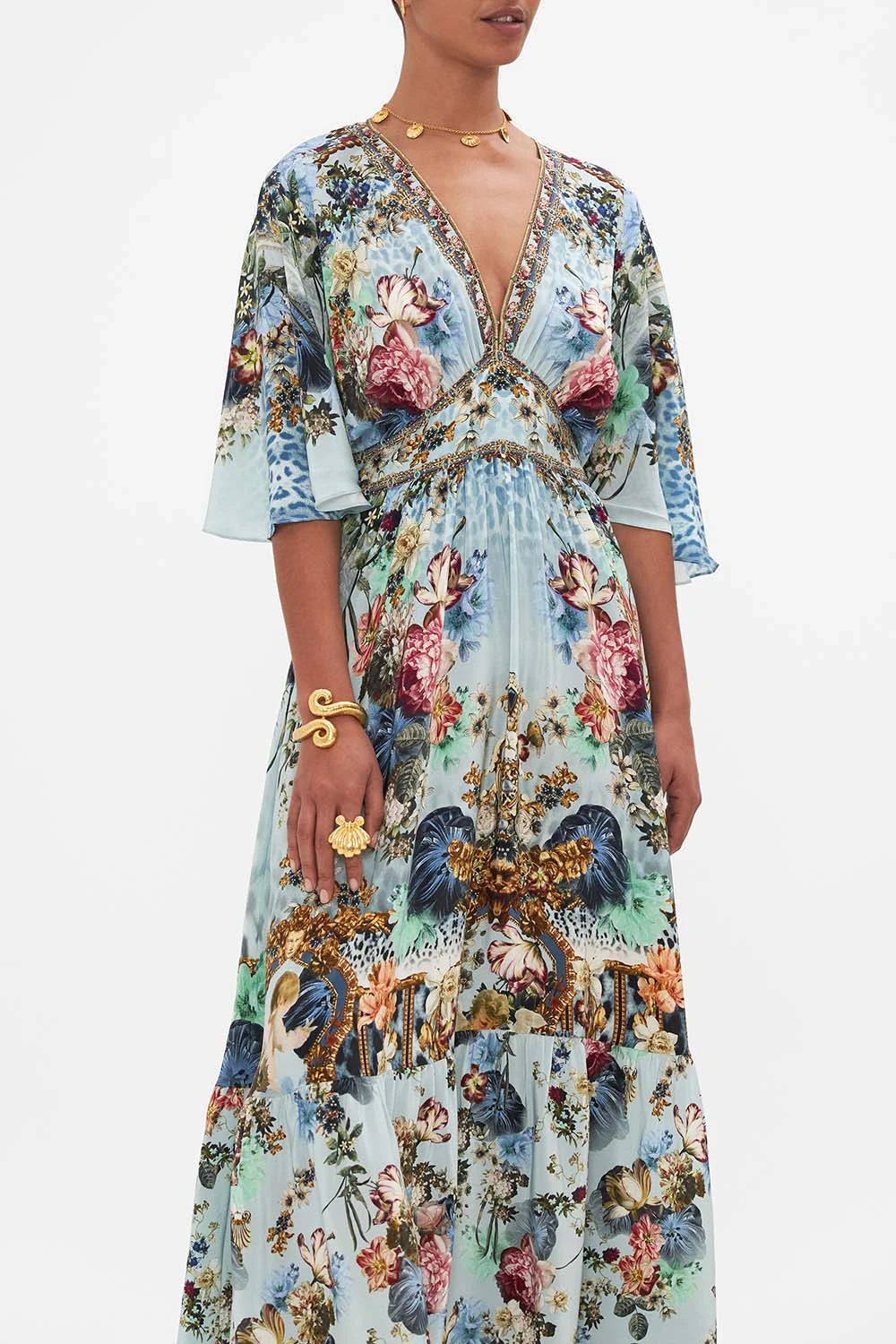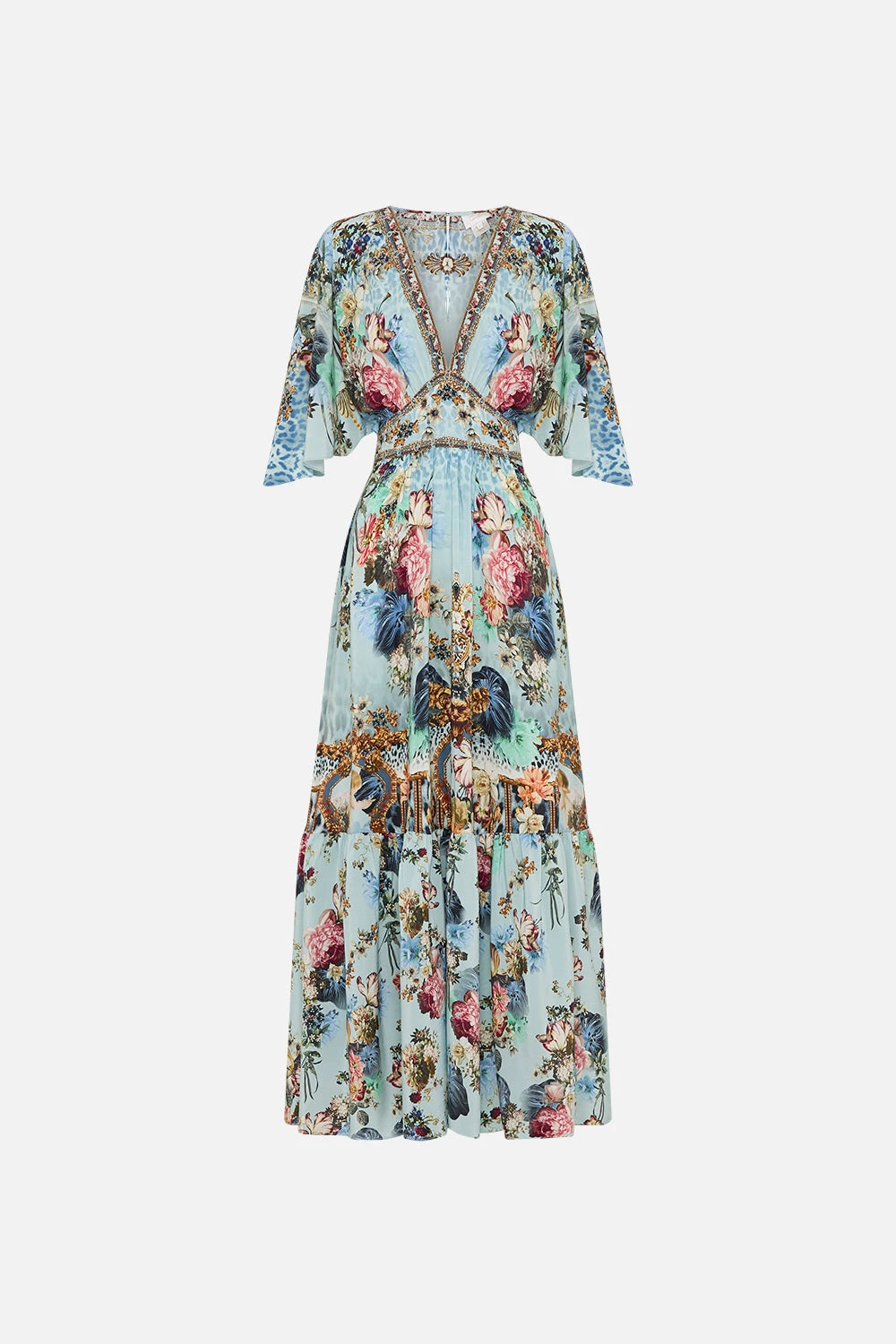 The Letters To Leo Waisted Dress With Hem Ruffle echoes the sweet symphony fresco blues awashed in opulent florals, ethereal cherubs and grand gilded archways. A beautifully feminine silhouette, this luxury silk maxi dress features signature crystal embellishments, a shaped waistband with back shirring details to cinch and accentuate the curves, floaty draped statement sleeves, pocket functionality and a wide ruffle on the full length hemline. Designed to move you stylishly from places, parties and magical moments. Lovingly handcrafted, designed in Australia. Explore more from the Amore Mio collection.