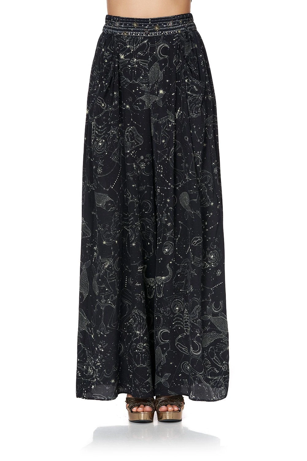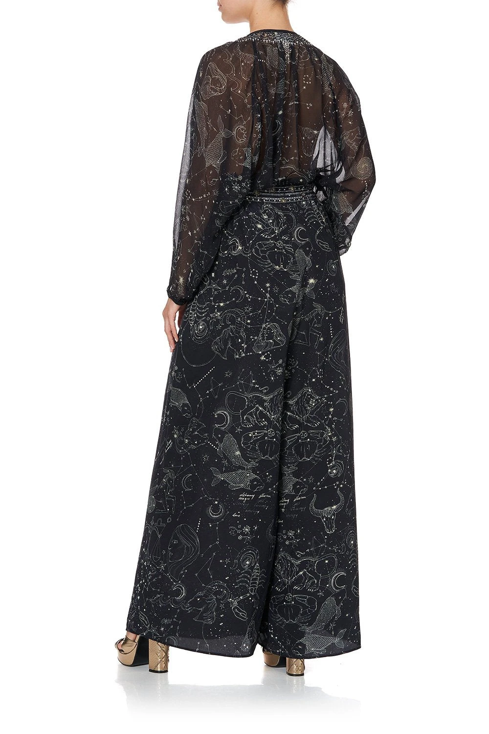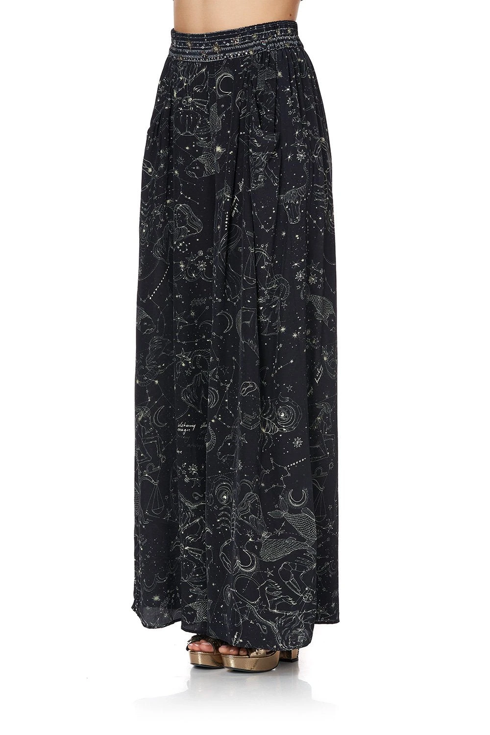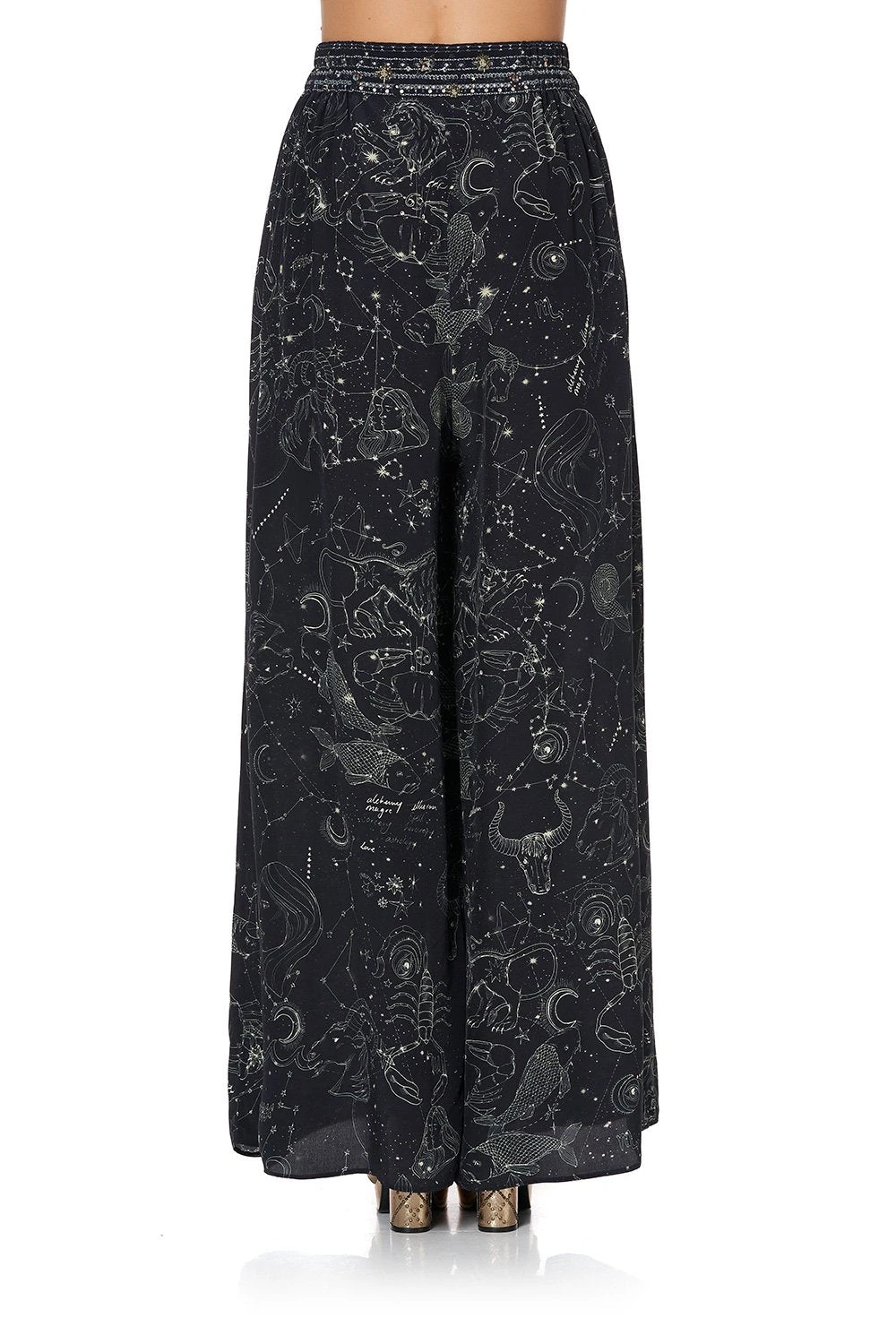 A wide leg statement trouser for wanderers of the universe, the Moon Set Wide Leg Pant with Gathered Pockets are simply magical. Crafted in a hypnotic black-based CAMILLA print referencing constellations from the night sky – these 70s style trousers feature flared legs, a comfortable elasticated waist for free movement and statement gathered front pockets. Style back with matching Moon Set Tie Front High Low Hem Blouse.