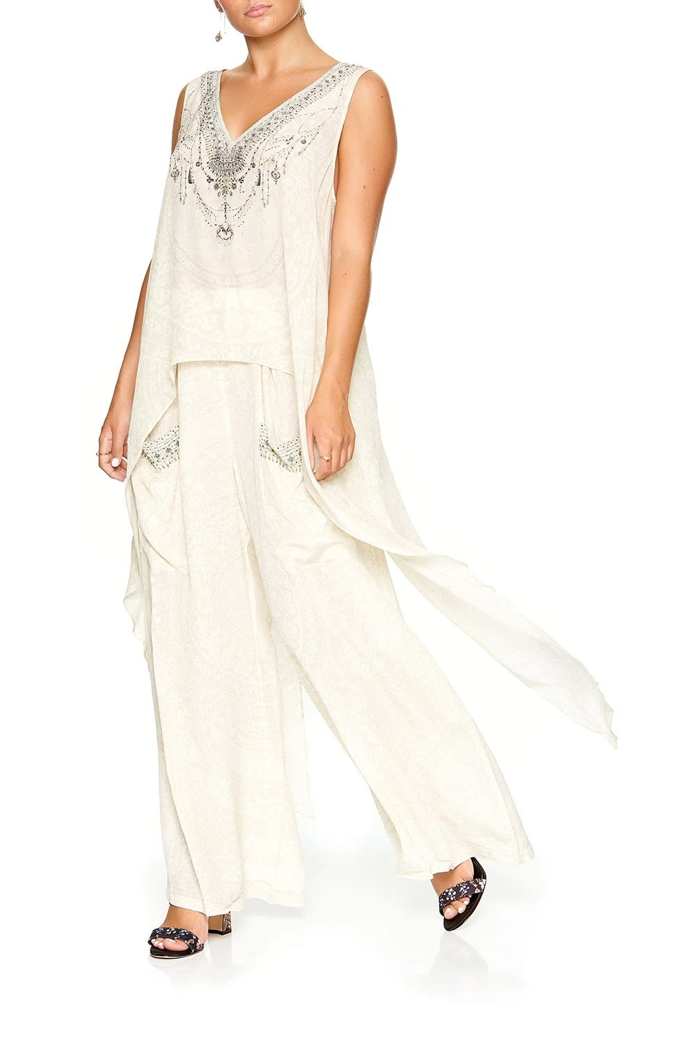 With echoes of the sumptuous palaces of Versailles, the Dentelle Blanche Wide Leg Trouser with Front Pockets is unashamedly decadent. Featuring creamy silk, elastic back waist, as well as patch pockets with crystal embellishment – these bejeweled pants are ideal for dusk till dawn soirees.