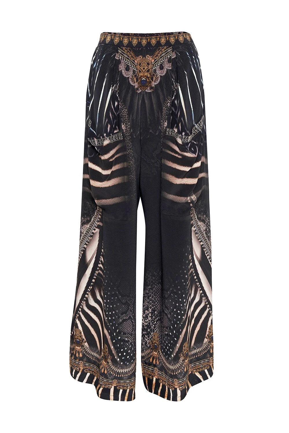High rise and high impact, the Quechua King Wide Leg Trouser With Front Pockets offers a silk cascade in a wide-leg silhouette. Inspired by the beginnings of time, soft black silk sets the scene for bronzed animal print and tantalising crystal detailing. These statement flared pants feature an elasticated waistline, front pockets and a relaxed silhouette to encapsulate all that is comfort. Pair back with the .